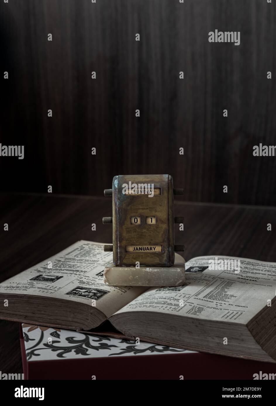 Antique Brass Desktop Perpetual Calendar on an Old wooden floor Stock