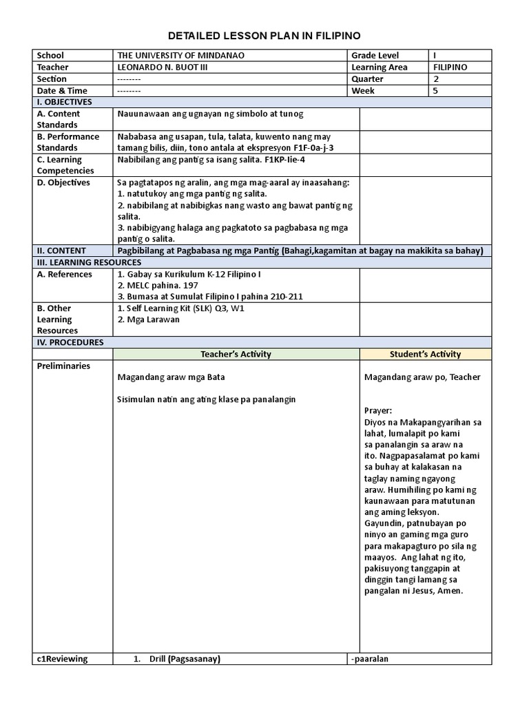 Matatag Detailed Lesson Plan Template