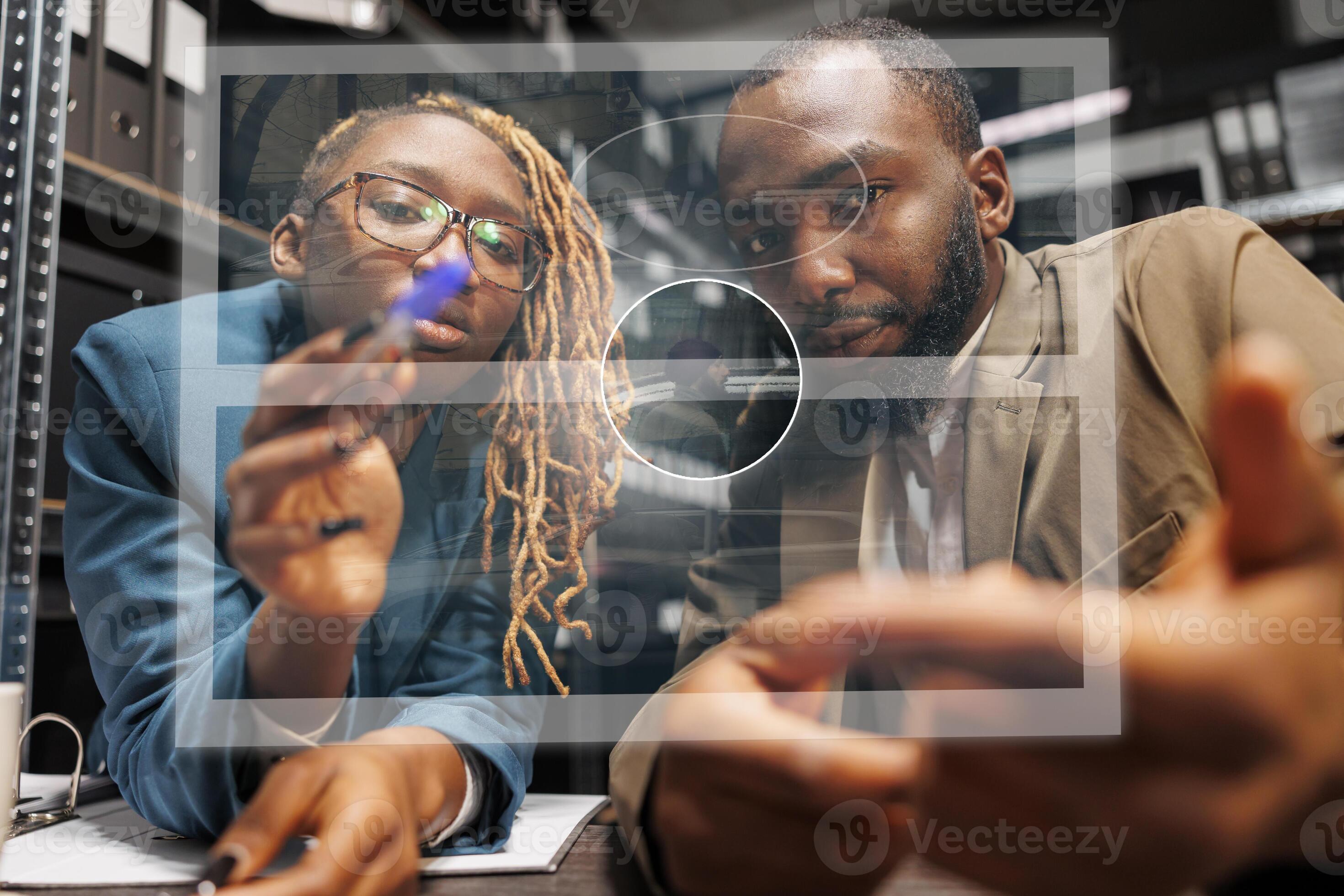 Young detectives checking hologram in incident room examining