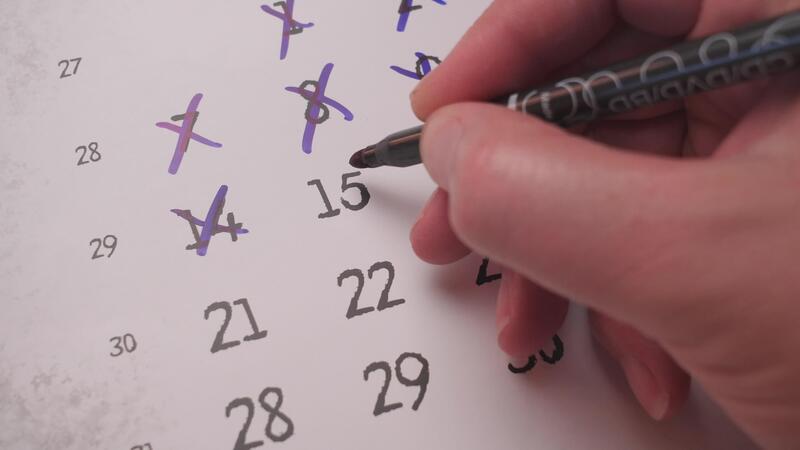 Female Hand Marks Days of Menstrual Cycle in Calendar with Red Pencil