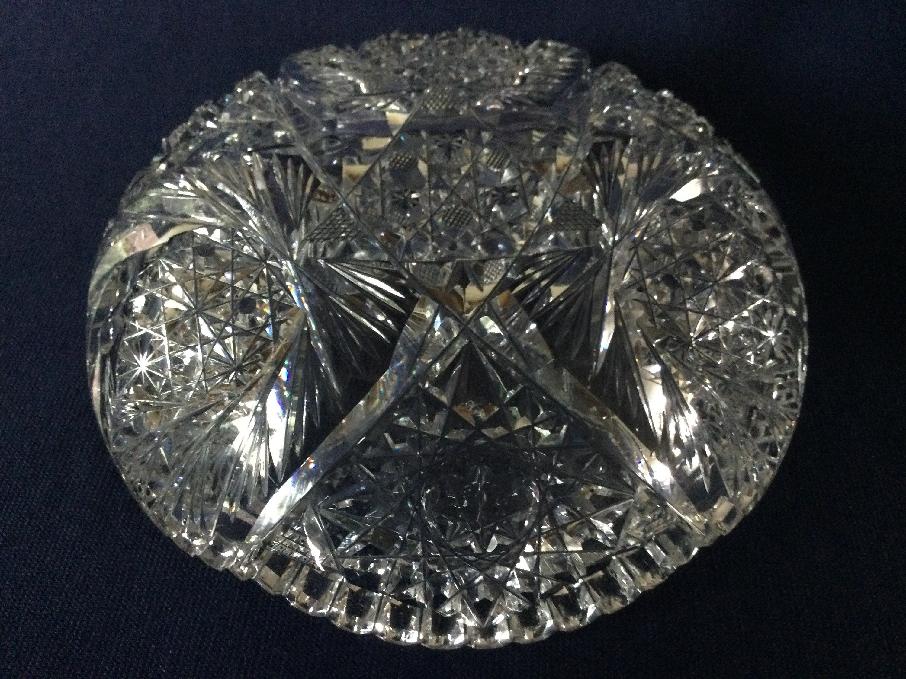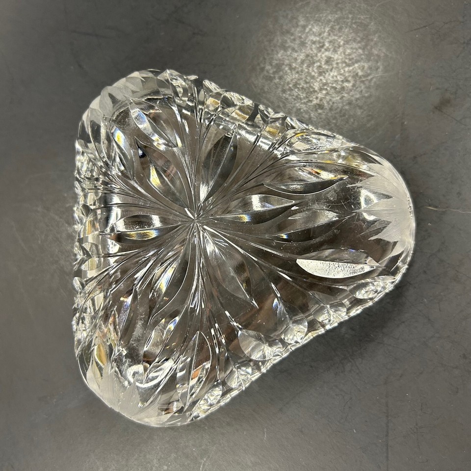 American Brilliant Cut Glass Triangle Bowl with Wheel Cut Flowers