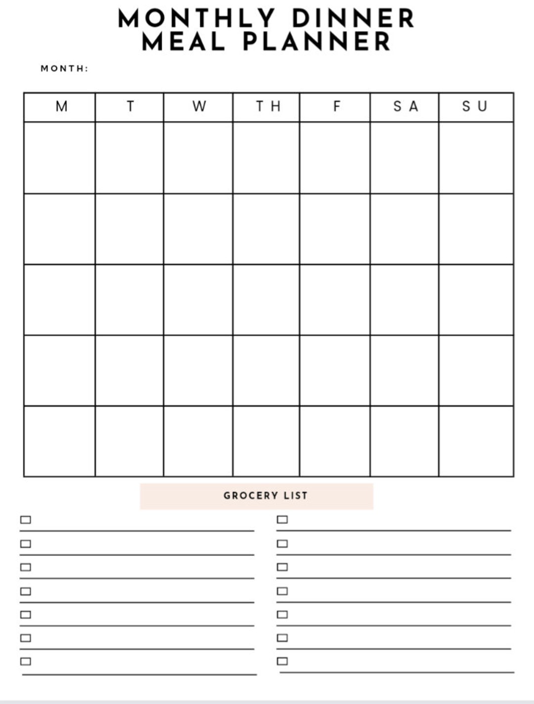Monthly Dinner Calendar Template With Shipping List Instant Download Etsy