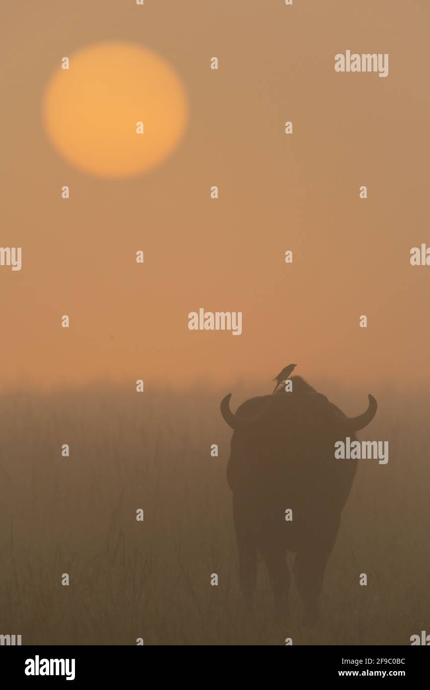 Bird on Cape buffalo walking towards sunrise Stock Photo Alamy