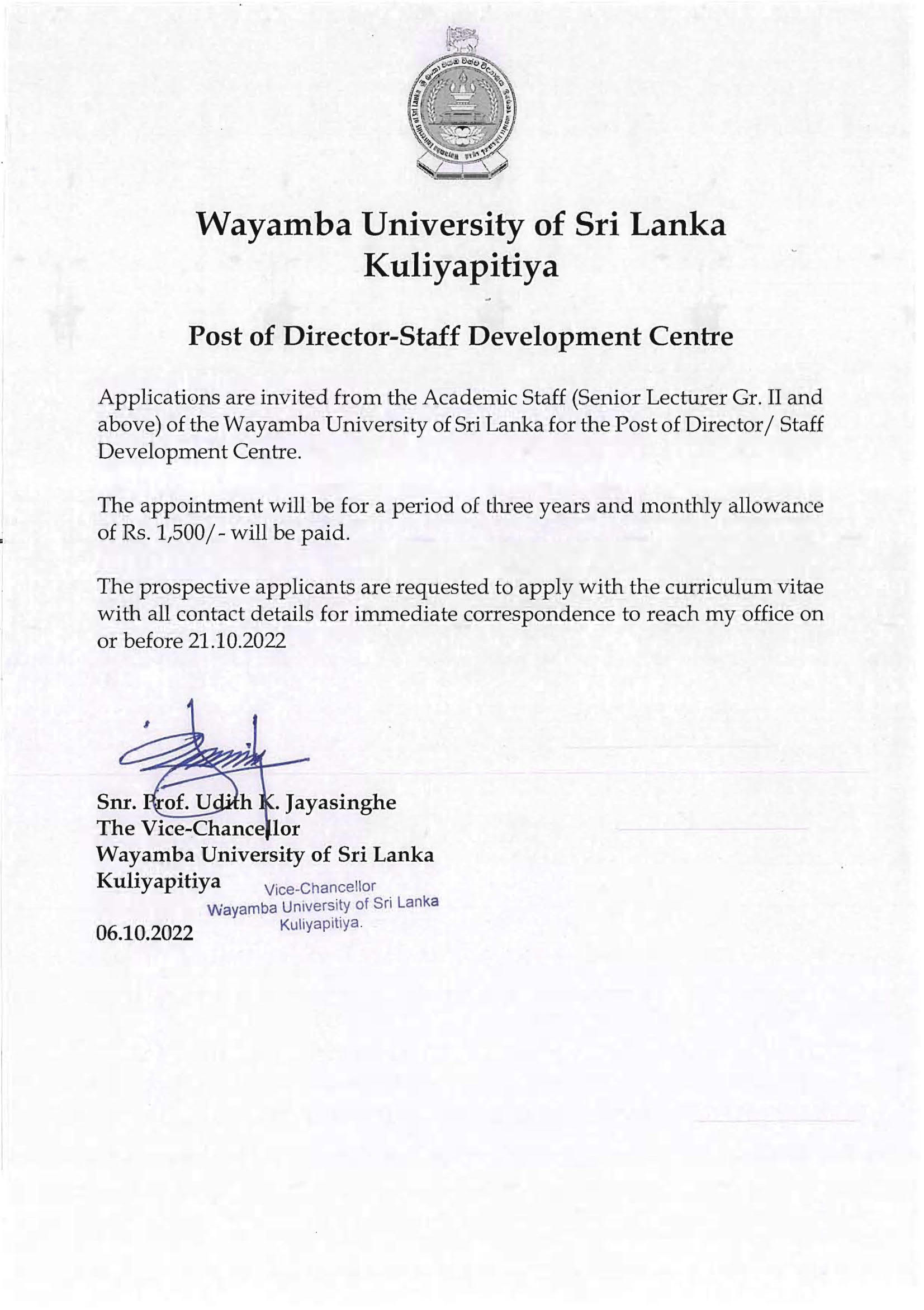Post of Director: Staff Development Centre Wayamba University of Sri