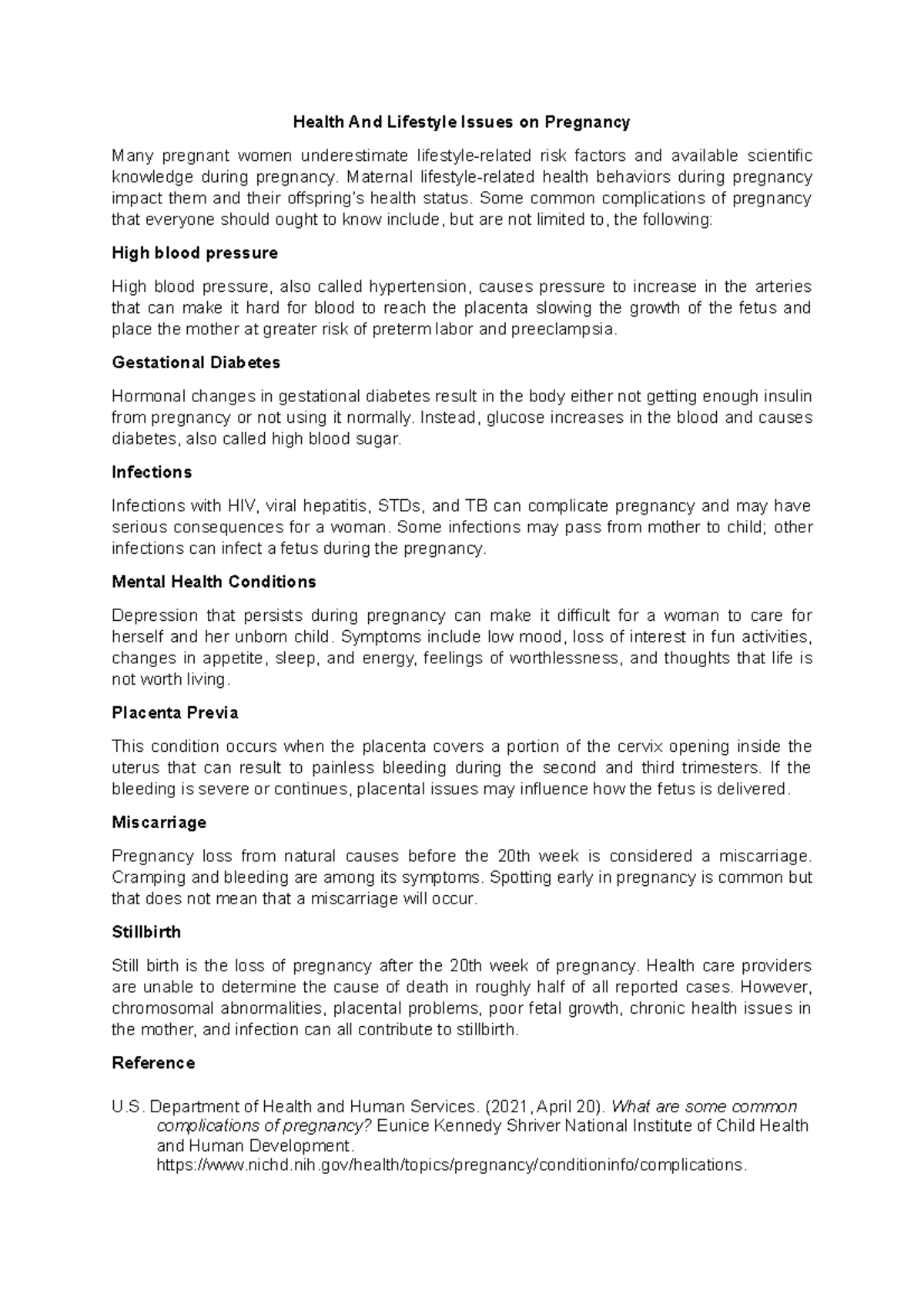 Health and Lifestyle Risk of Pregnancy and Fetal Chart Lecture notes