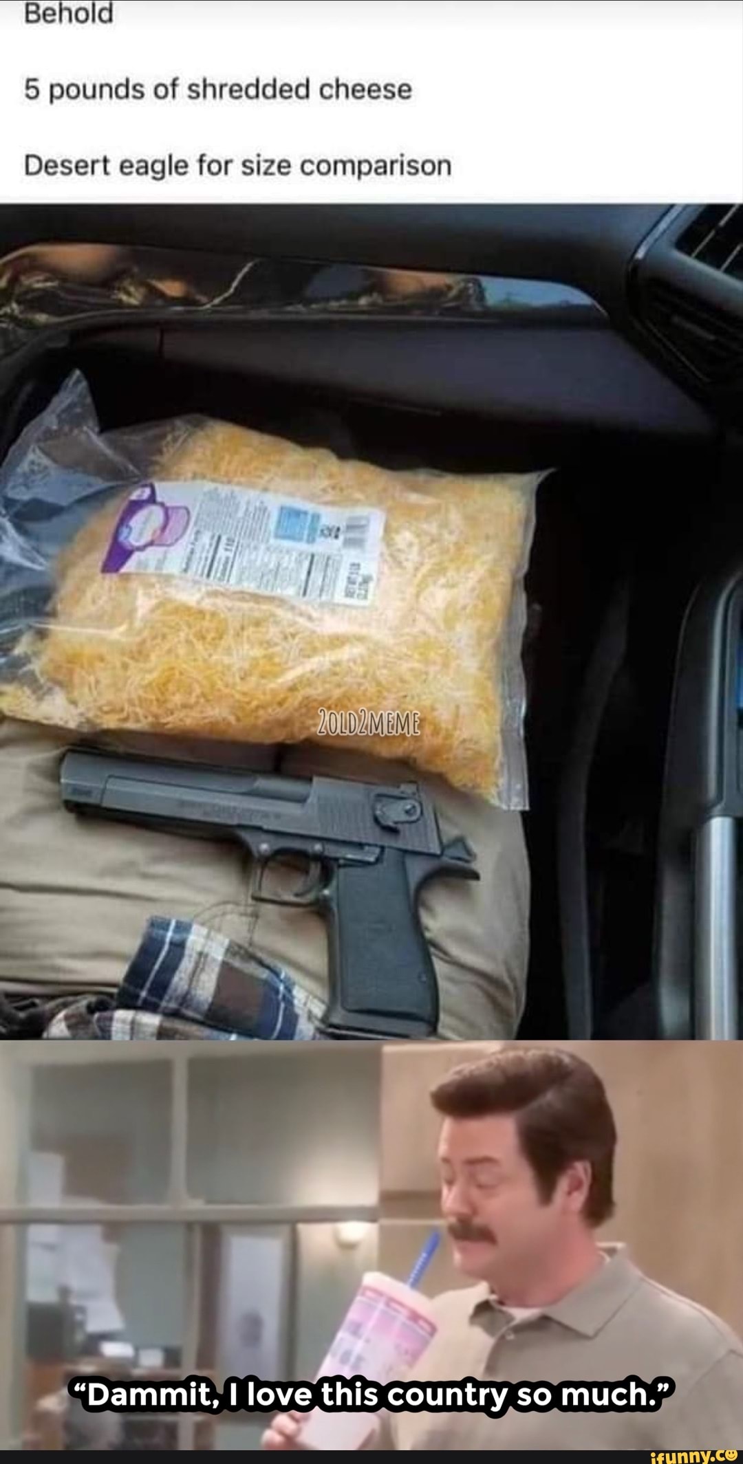 Behold 5 pounds of shredded cheese Desert eagle for size comparison
