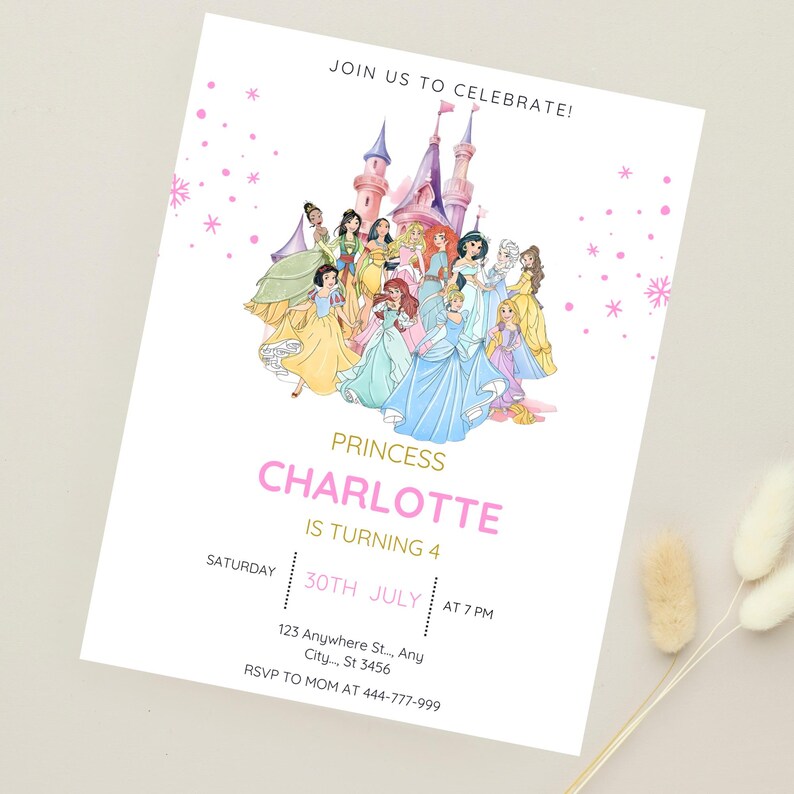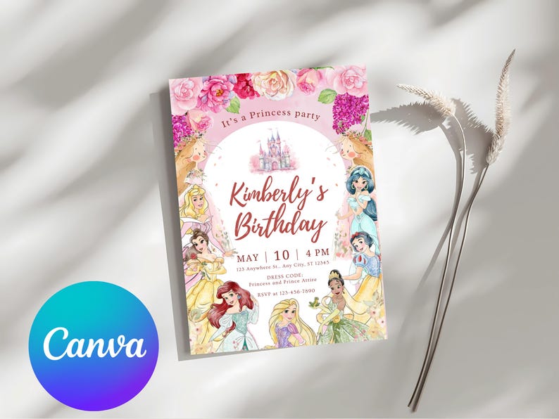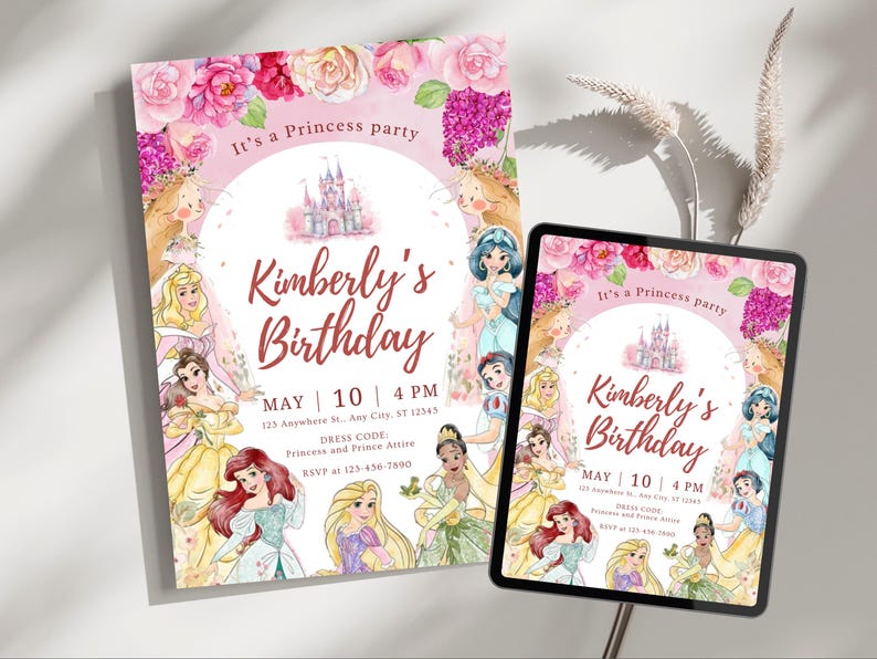 Watercolor Princess Birthday Invitation Editable Girls Party Invite