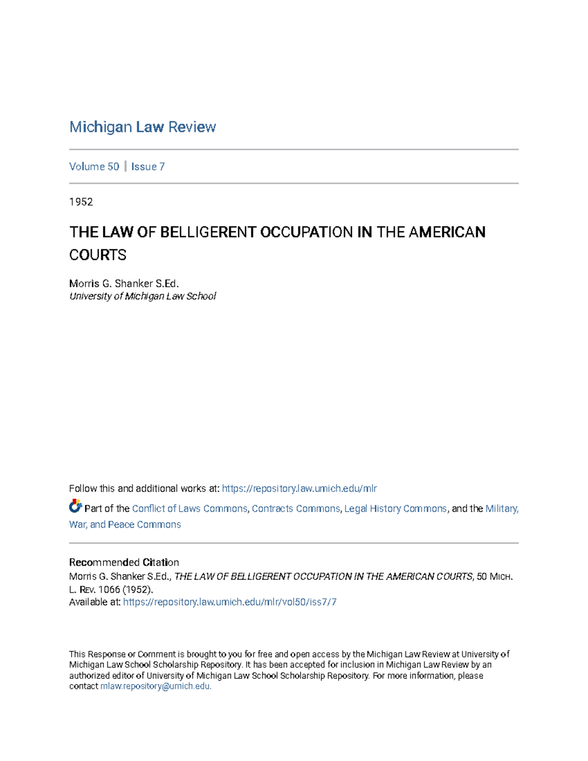 THE LAW OF Belligerent Occupation IN THE American Courts Michigan Law