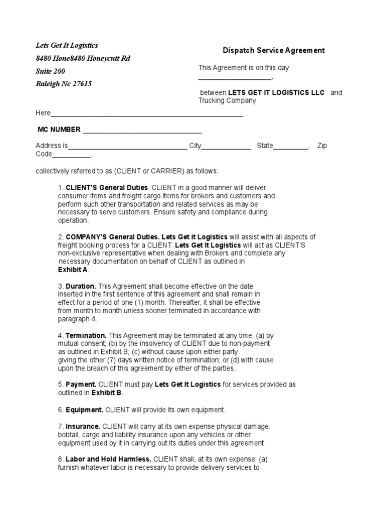 Dispatch Carrier Agreement Carrier Service Agreement Logistics