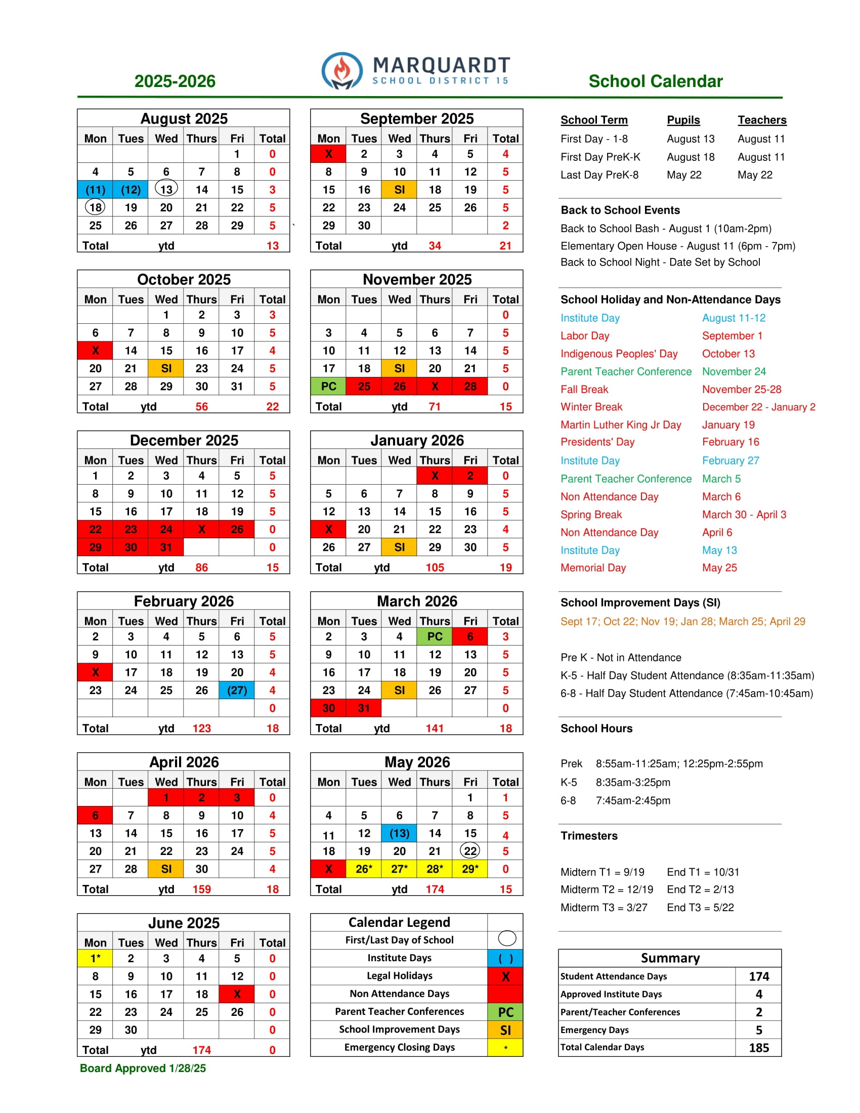 MARQUARDT SCHOOL DISTRICT 15 Calendar 25 26 revised EduCounty