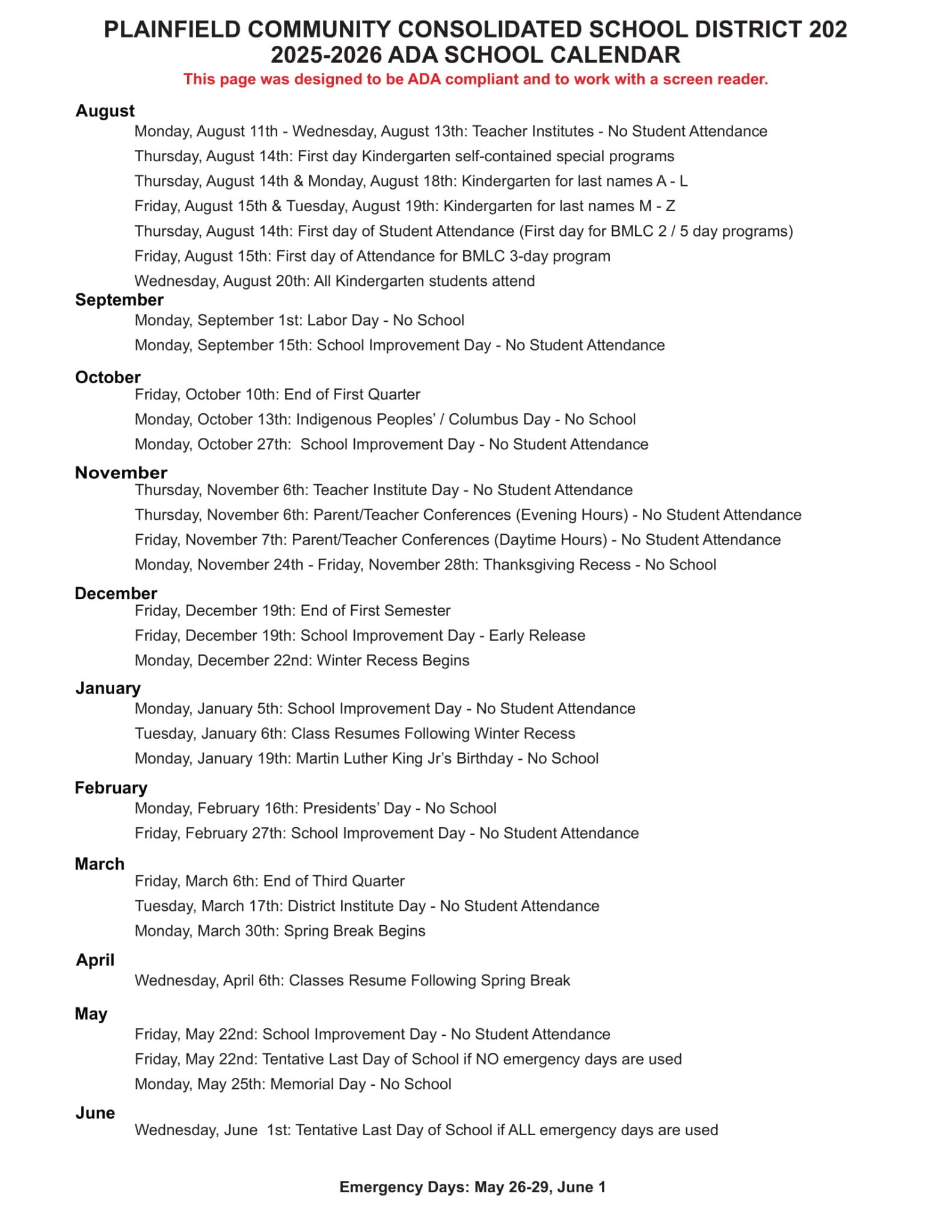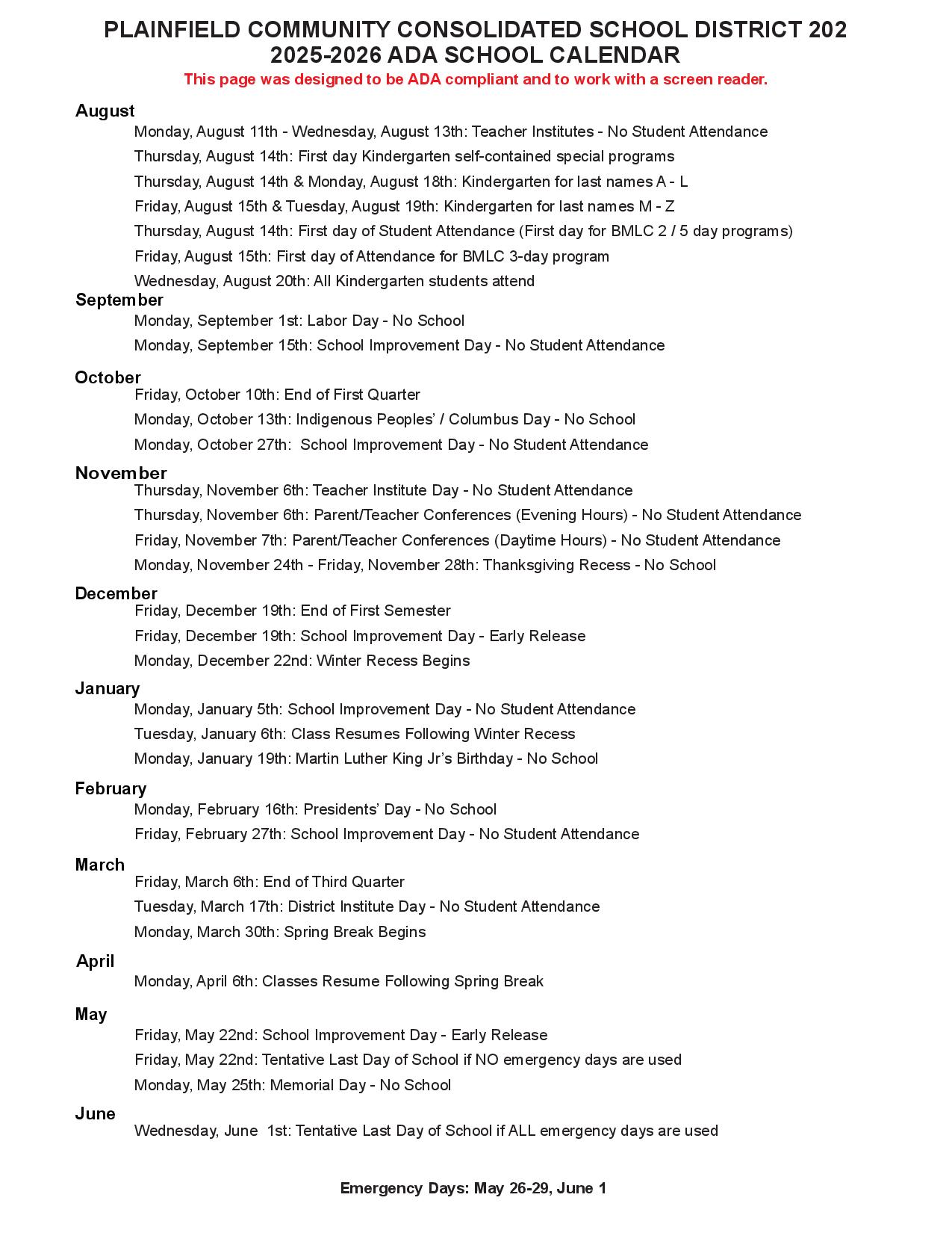 Plainfield District PSD202 Calendar 25 26 REVISED EduCounty