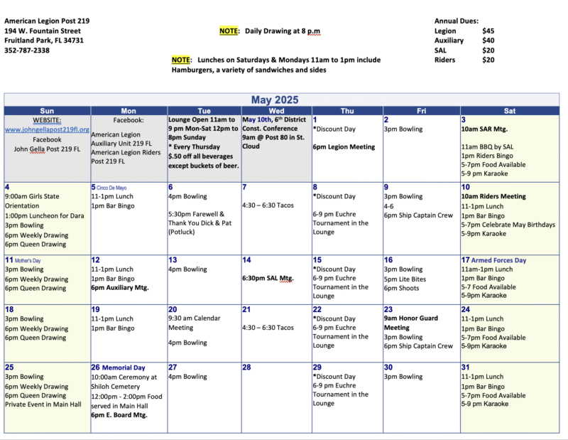 May 2025 Calendar American Legion Post 219 Florida
