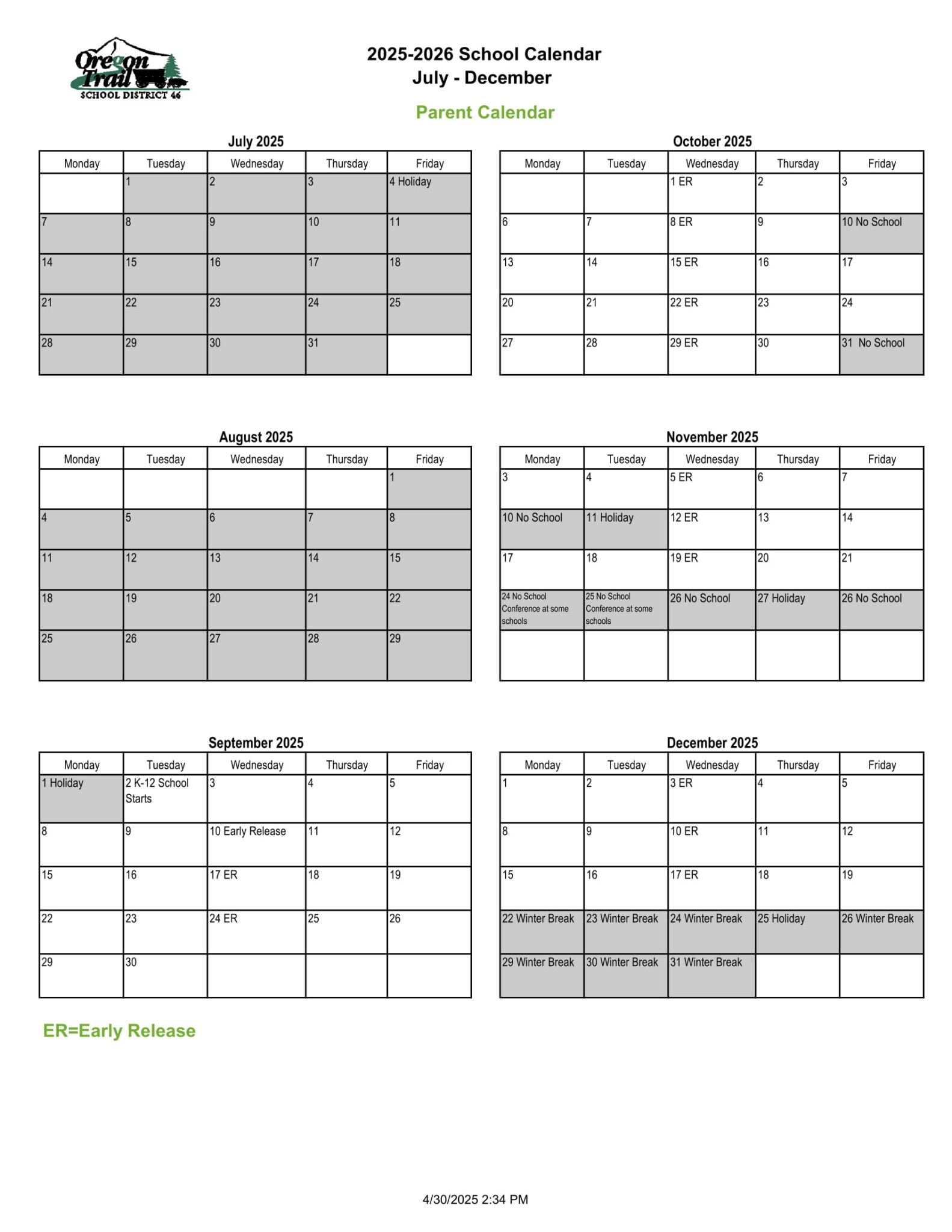 Oregon Trail School District 25 26 Calendar Revised PDF EduCounty