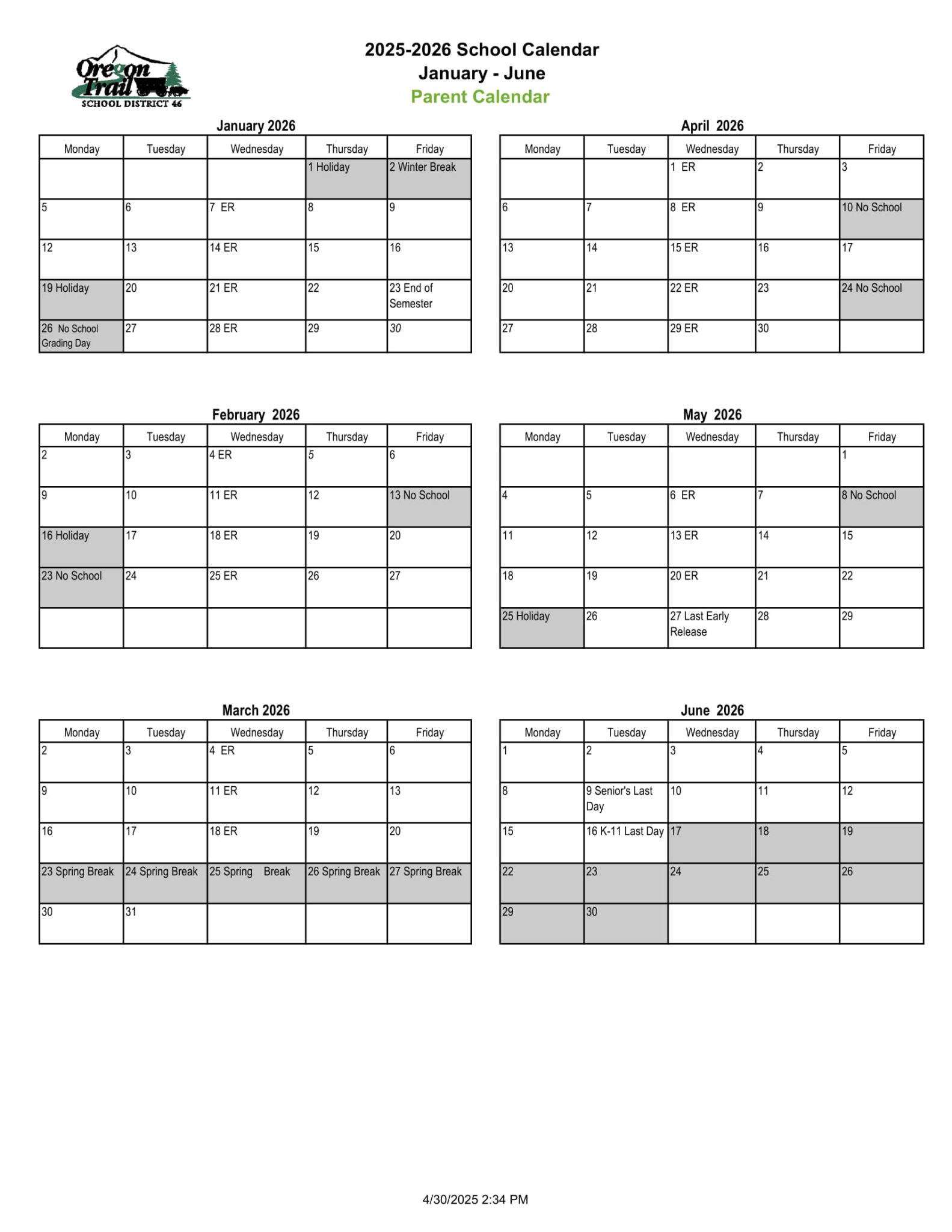 District Calendar School District 46