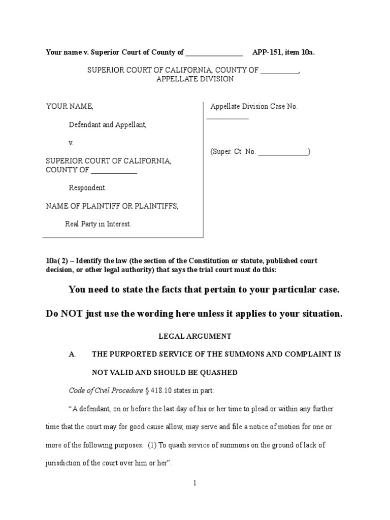 Sample Petition For Writ of Mandate To Appeal Denial of Motion To Quash