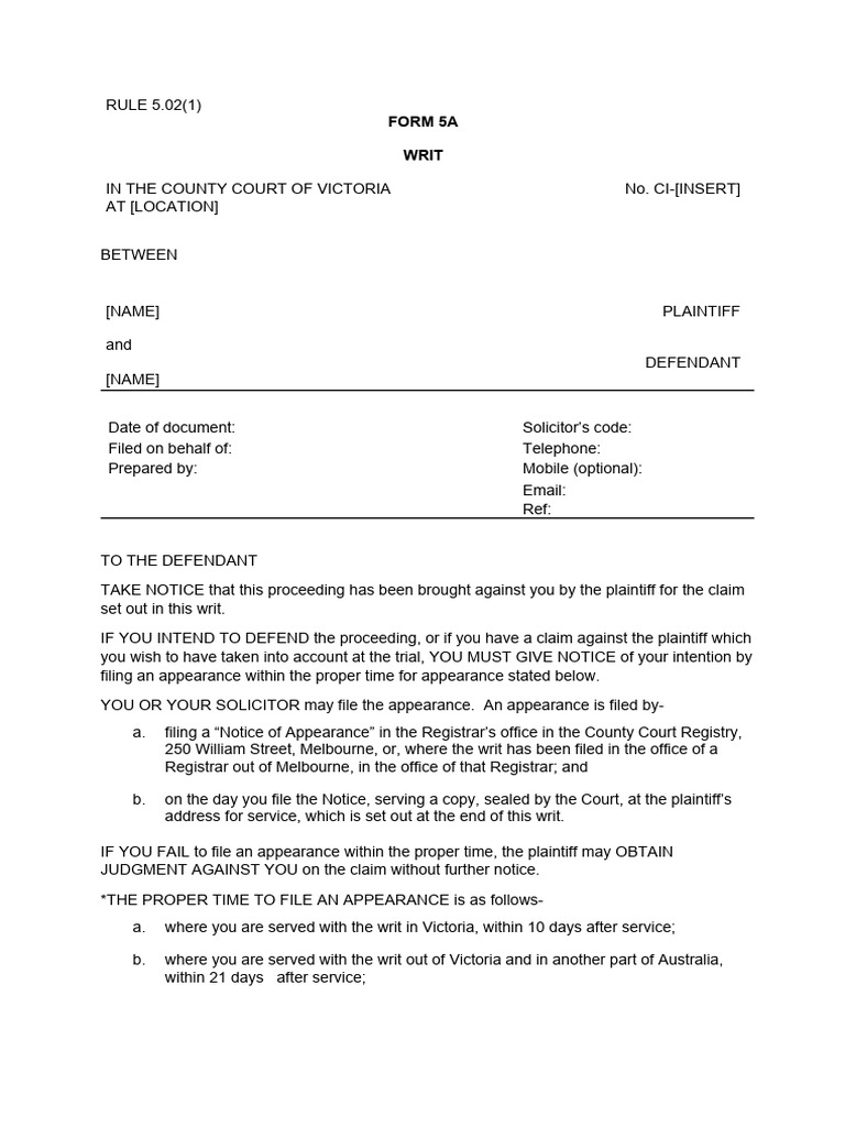 County Court Writ of Summons Form 5A PDF Writ Common Law