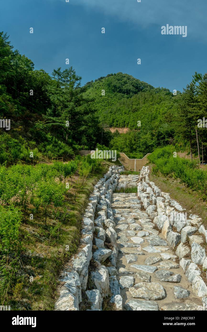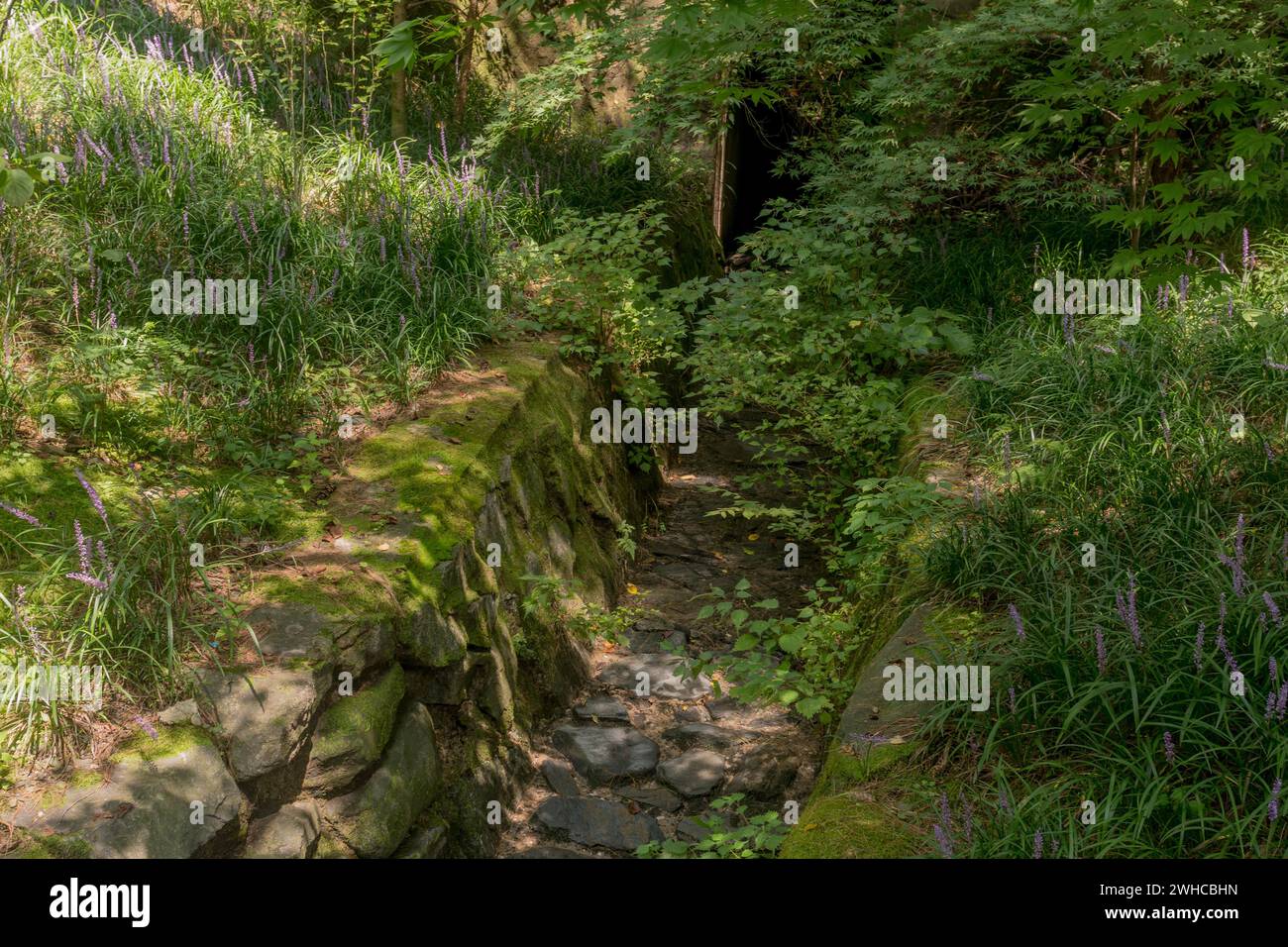 Rain drainage ditch made of stones shaded by surrounding plants in