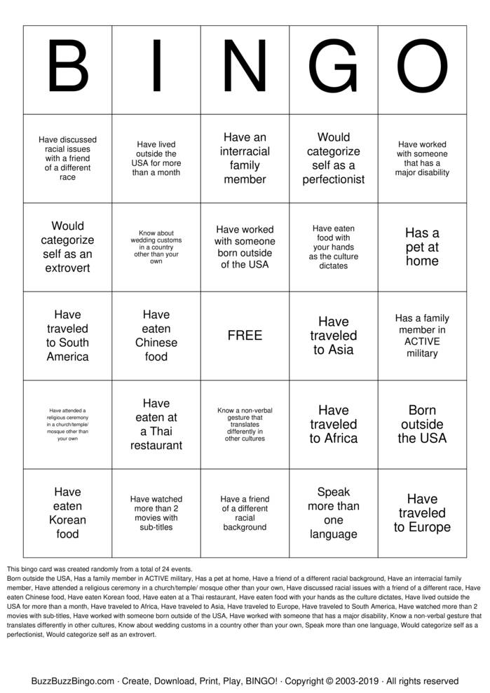 Cultural Diversity Bingo Cards to Download Print and Customize