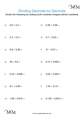 Dividing decimals worksheet for 5th and 6th grade Free printable PDF