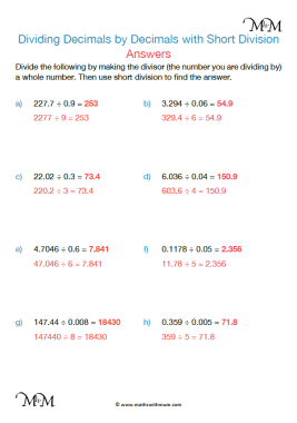 Dividing Decimals by Whole Numbers and Decimals Worksheet Answer KEY