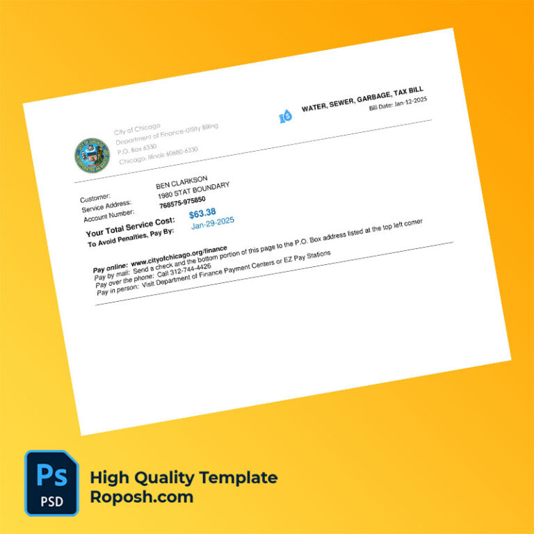 USA Illinois City of Chicago Editable Water Sewer Garbage Tax Bill