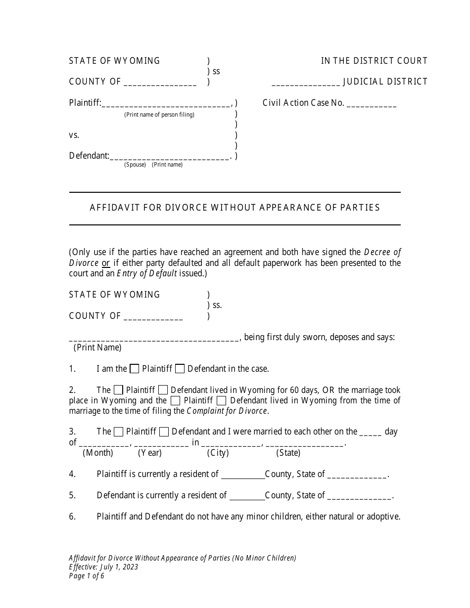 Free Wyoming Affidavit for Divorce without Appearance of Parties (No