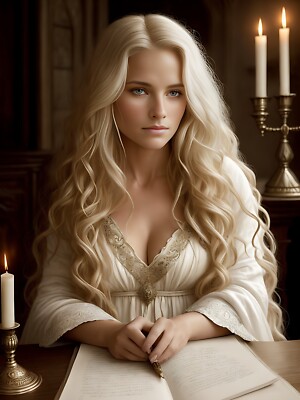 Beautiful girl blond hair tanned skin coppercolored eyes medieval