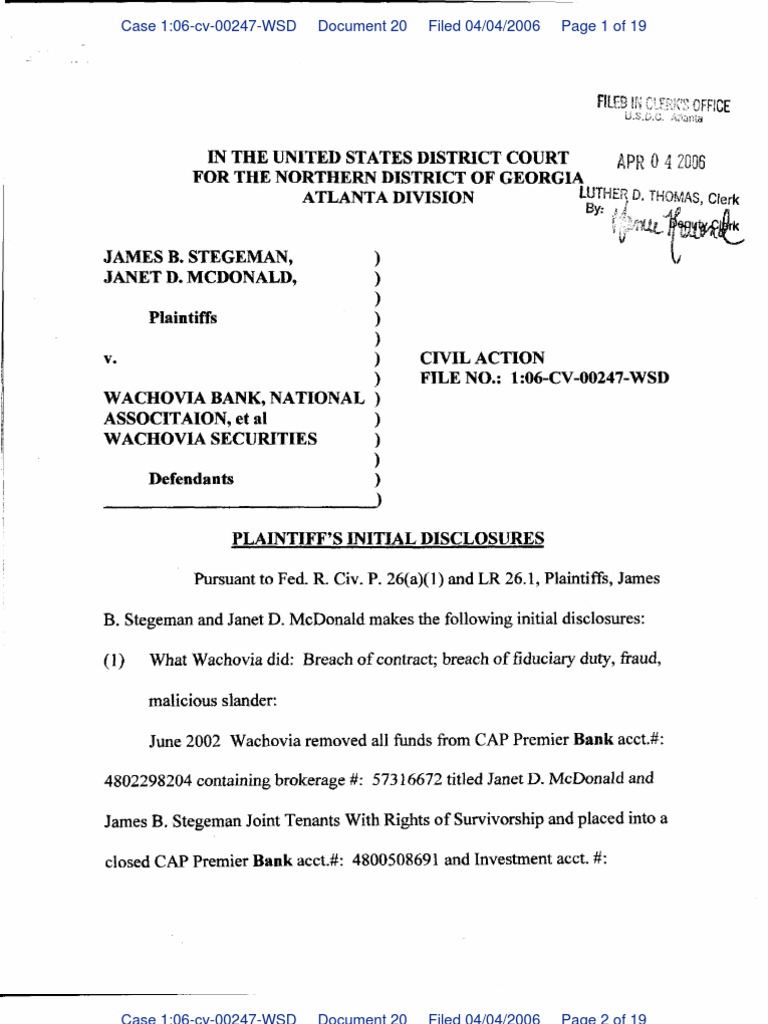 Plaintiffs Initial Disclosures Wachovia