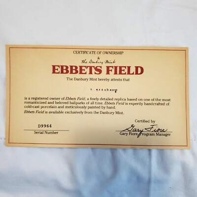 Danbury Mint Certificate Of Ownership COO Ebbets Field Brooklyn Dodgers