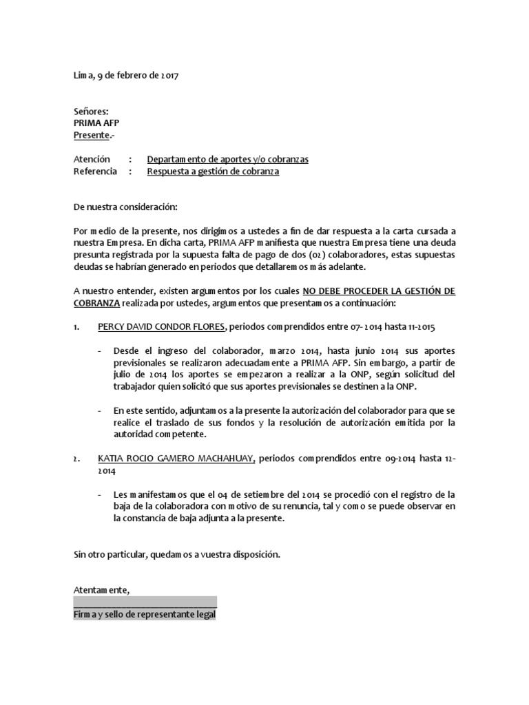 Carta de Respuesta A PRIMA AFP Gestión de Cobranza Indebida PDF