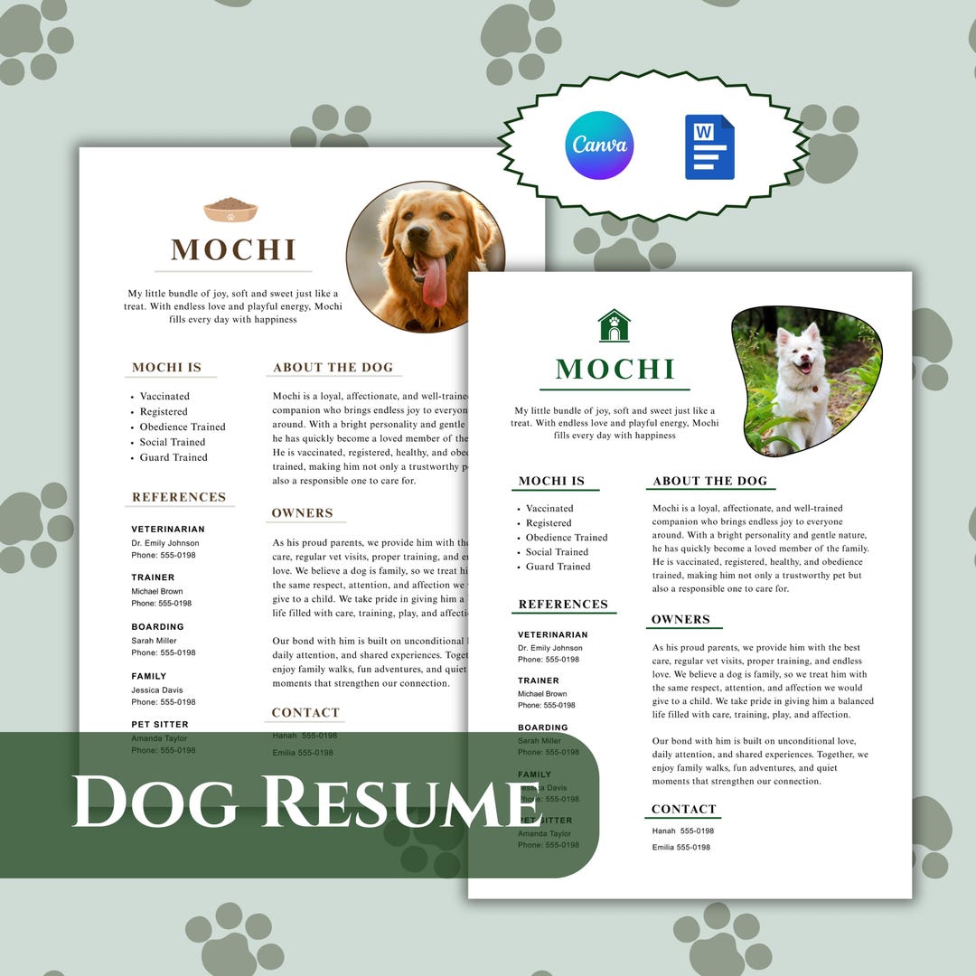 Dog Resume Template for Pet Sitter Canva Template Digital Download