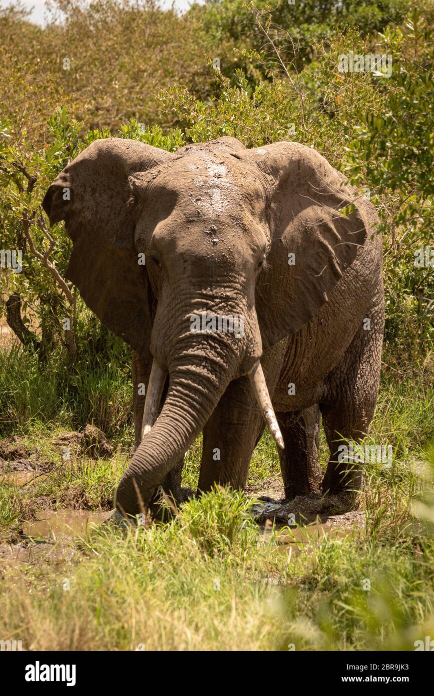 African bush elephant drinking from muddy pool Stock Photo Alamy