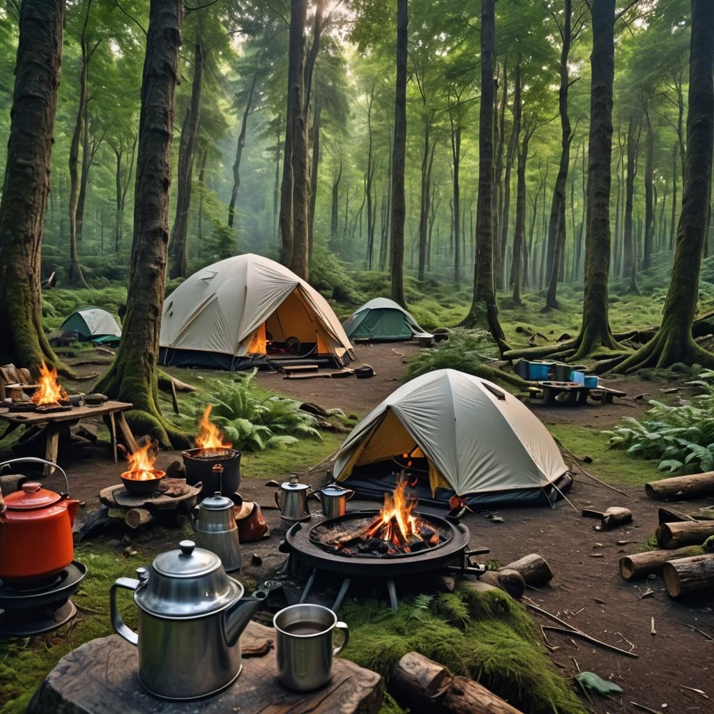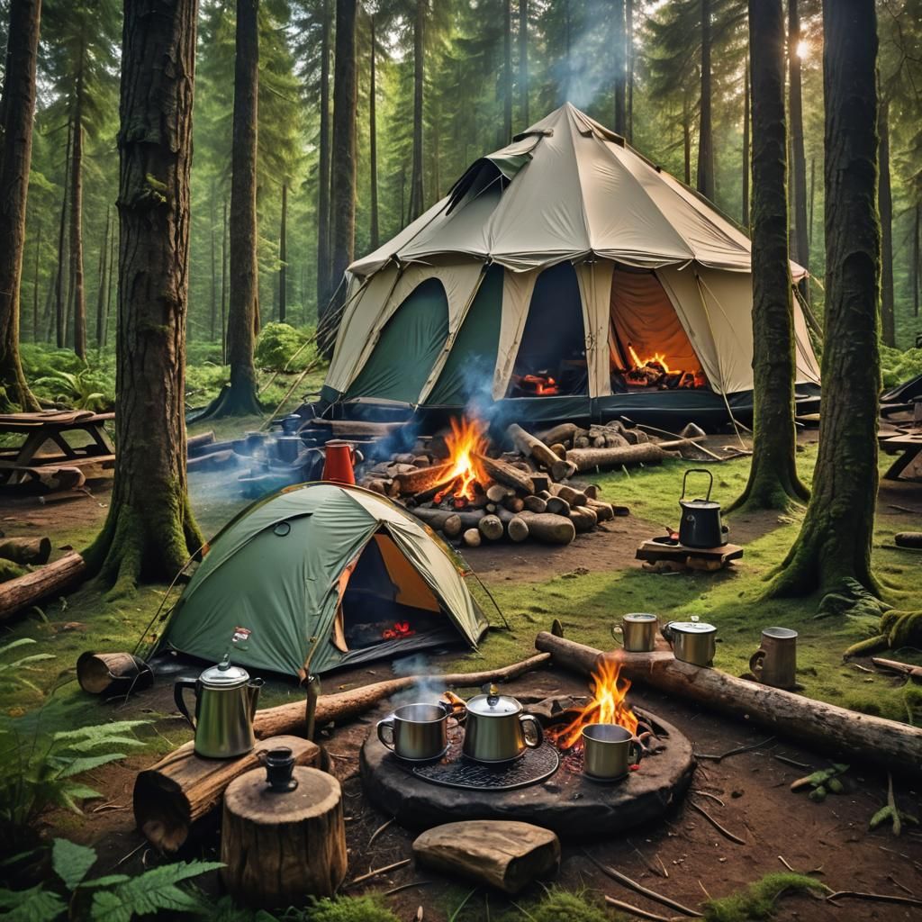 Making coffee in the morning on a campfire in front of a domed tent in