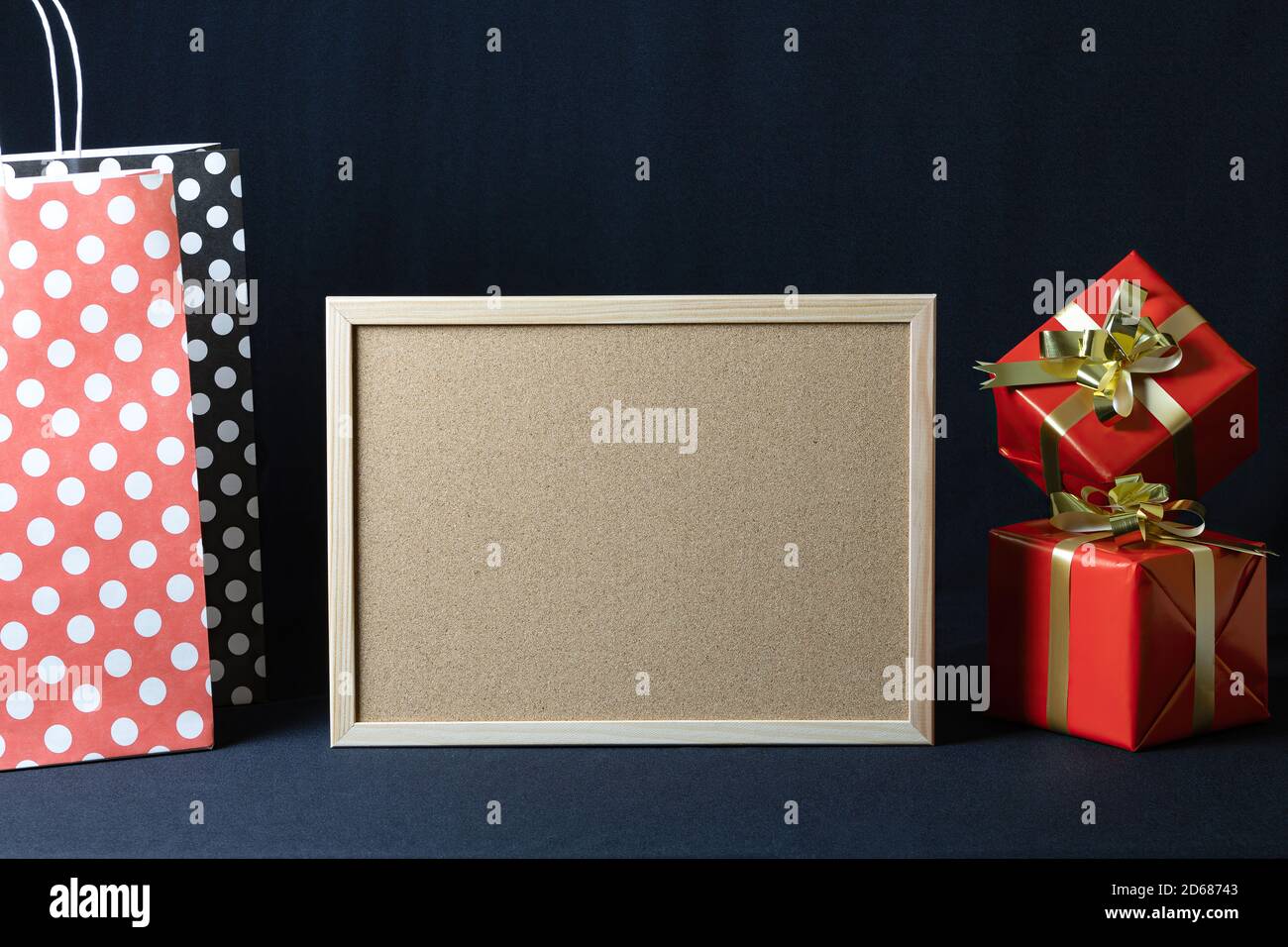 Polka dots paper bags corkboard and Christmas gift boxes with copy