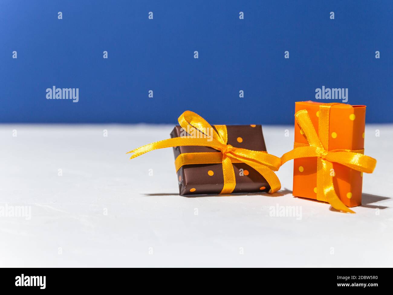 Gift boxes with color paper with polka dots tied yellow ribbon on white