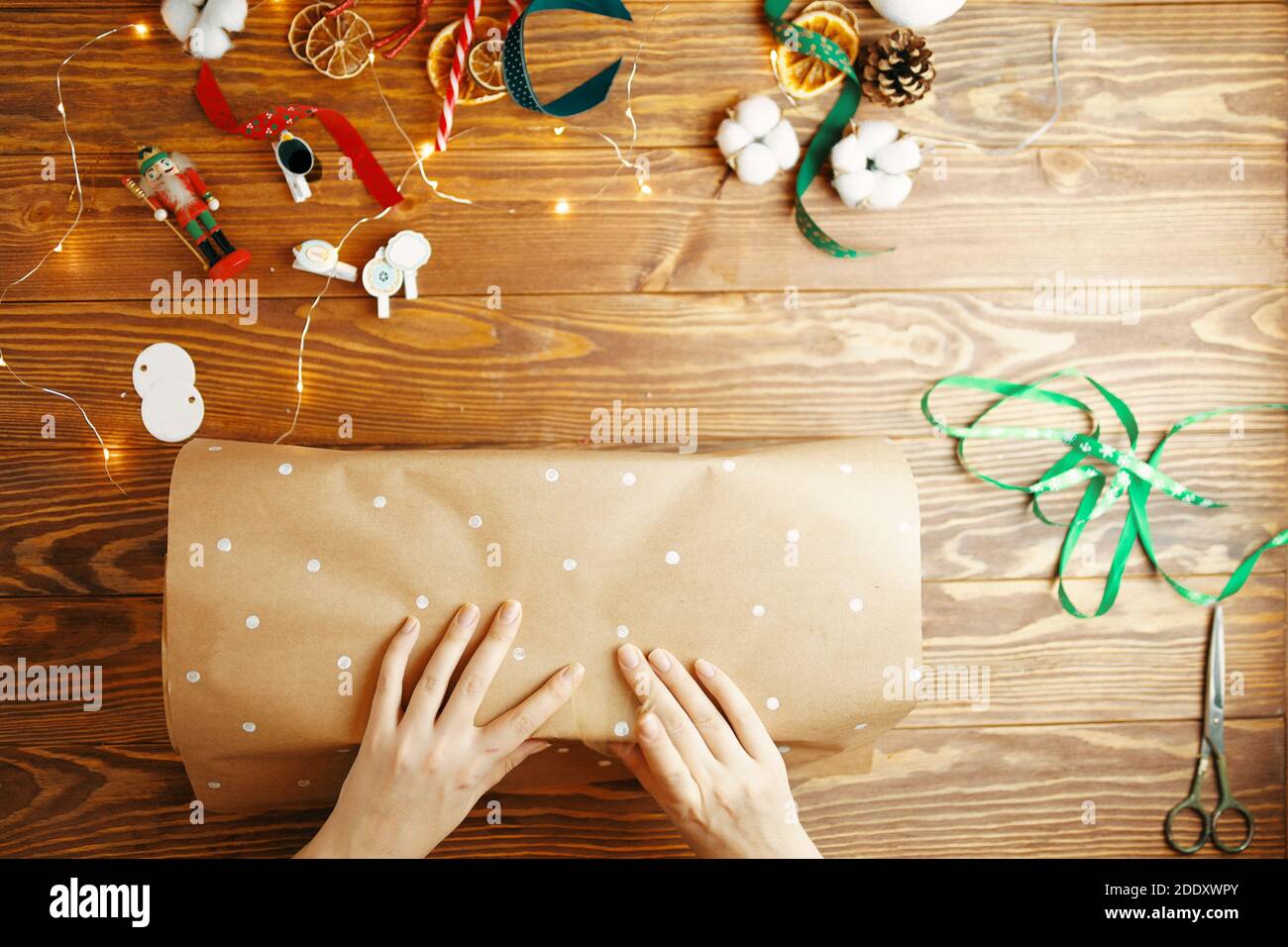 Top view of women #39 s hands packing Christmas gift on wooden table