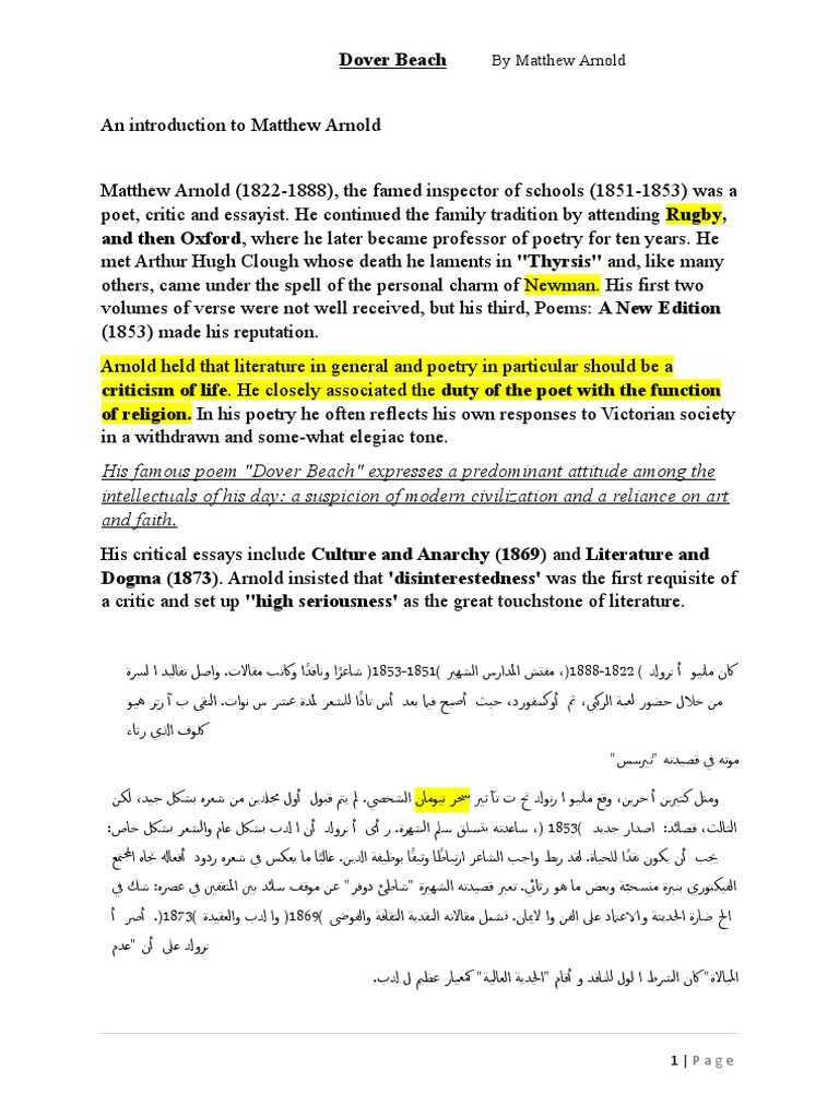 Dover Beach Critical Appreciation PDF Poetry