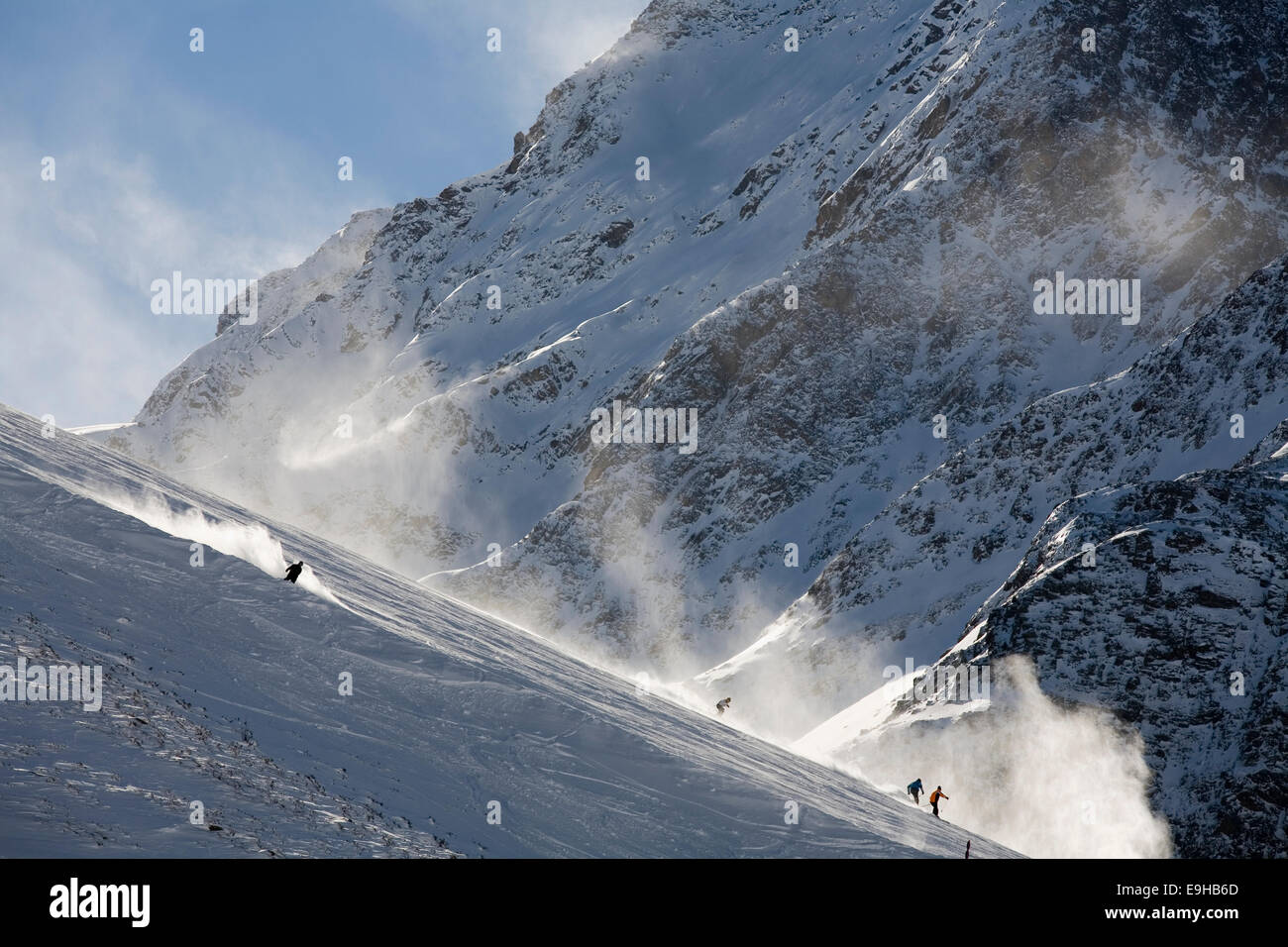 Skiers going downhill ski run in the Kuehtai ski resort Sellrain