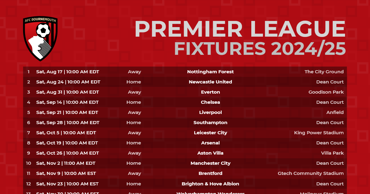 Download Premier League 2024/25 Fixtures for Bournemouth Soccer Fixtures
