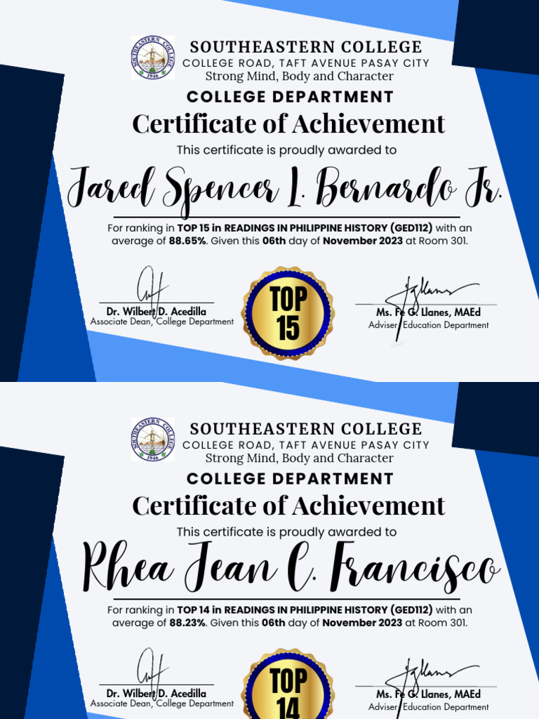 Reading in Phil History Certificate PDF