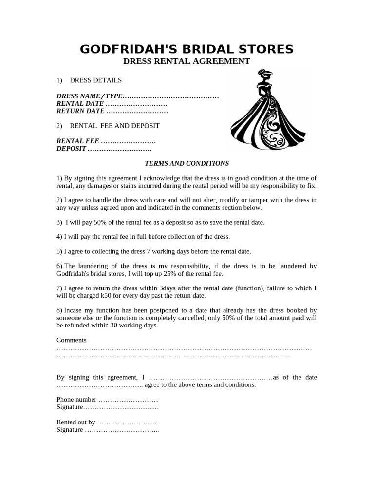 Dress Rental Agreement Formal Dress Gown Rental Contract Editable
