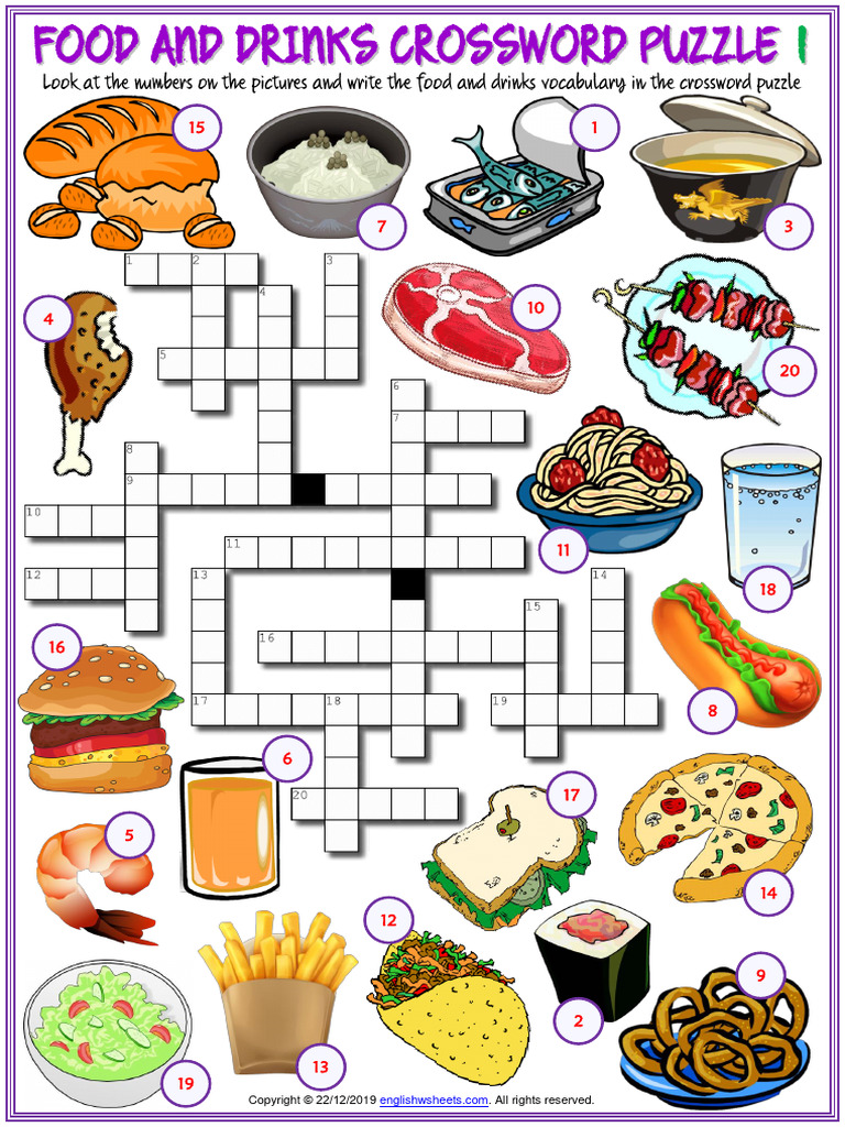 Food and Drinks Vocabulary Esl Crossword Puzzle Worksheets For Kids PDF