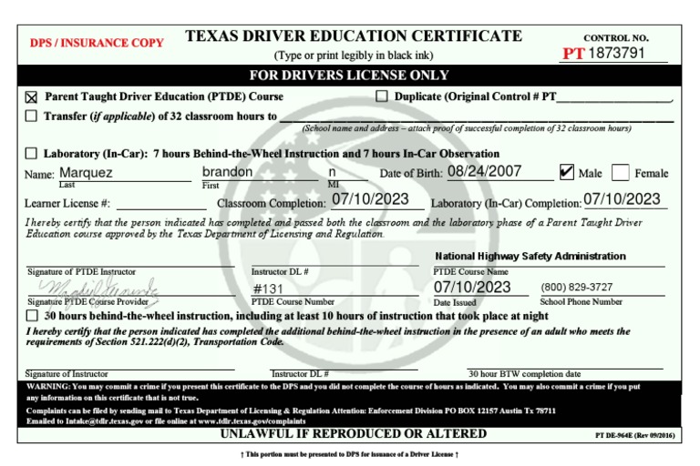 Texas Driver Education Certificate: For Driver License Only For Drivers
