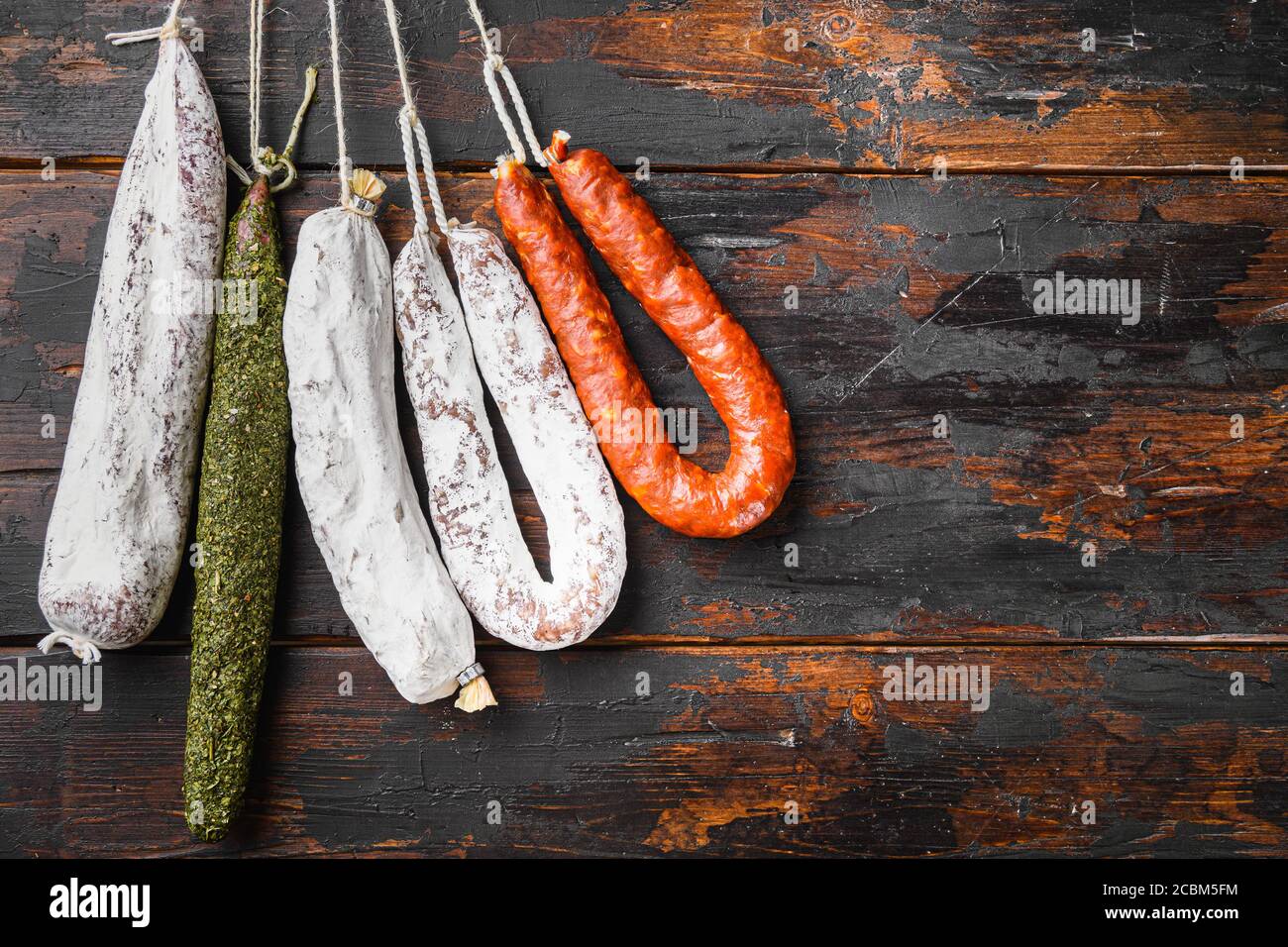 Dry Cured Spanish Meat Sausages Hanging on Wooden Surface Stock Photo