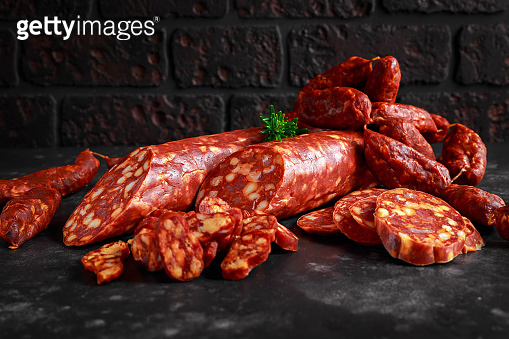 Variety of Dry Cured Spanish Pork Chorizo Sausages Made with Paprika