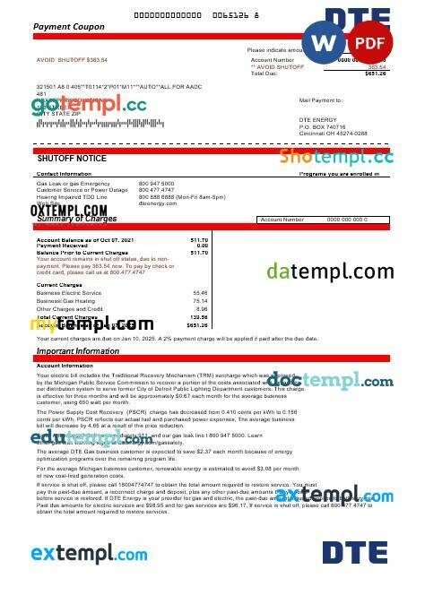 USA Michigan DTE Energy business utility bill template in Word and PDF