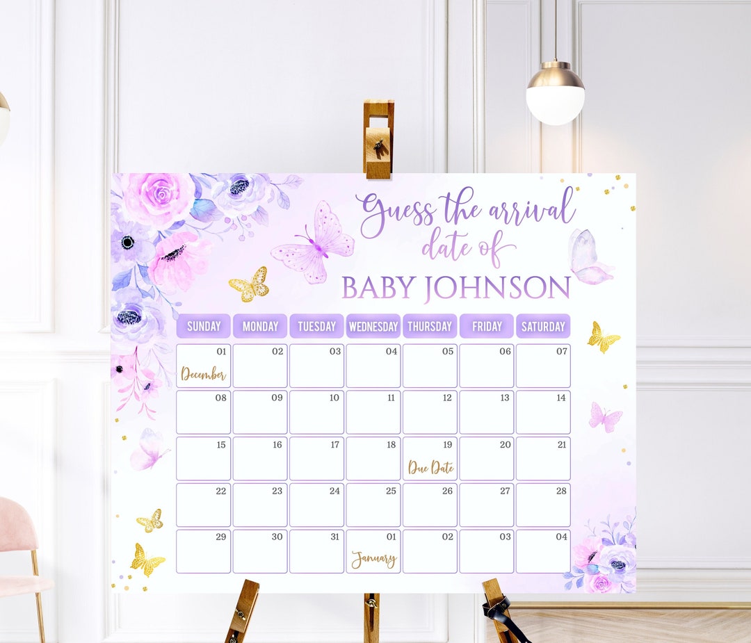 Editable Butterfly Due Date Calendar Purple Pink Roses Guess the Due
