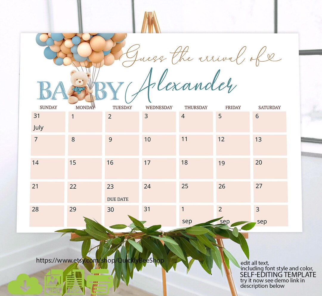 Editable Teddy bear Due Date Calendar Pregnancy Announcement Calendar