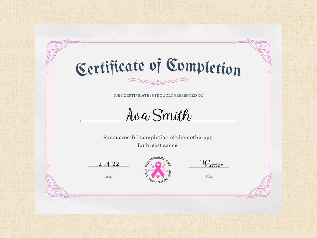 Breast Cancer Chemo Treatment Completion Certificate Instant Download