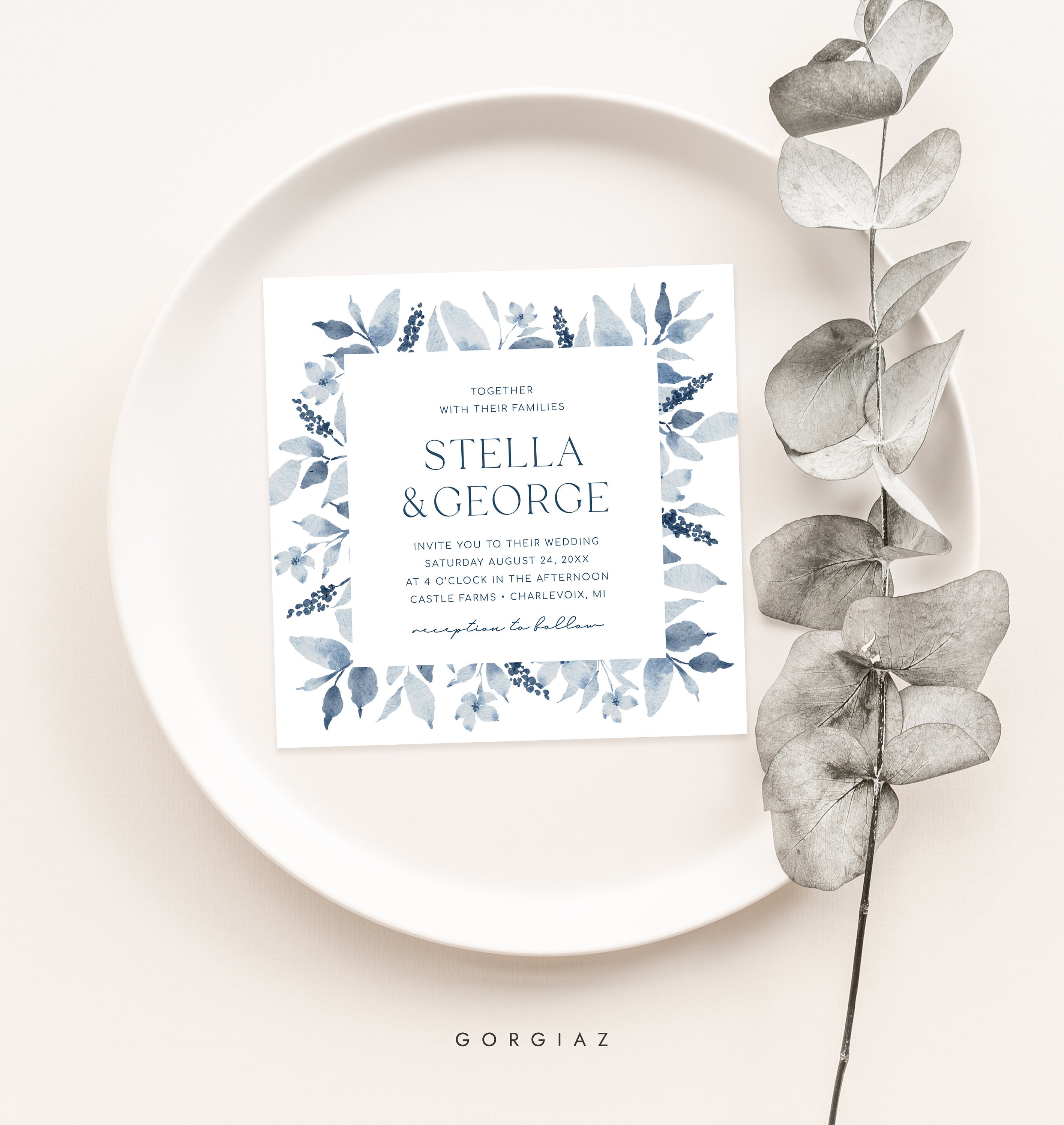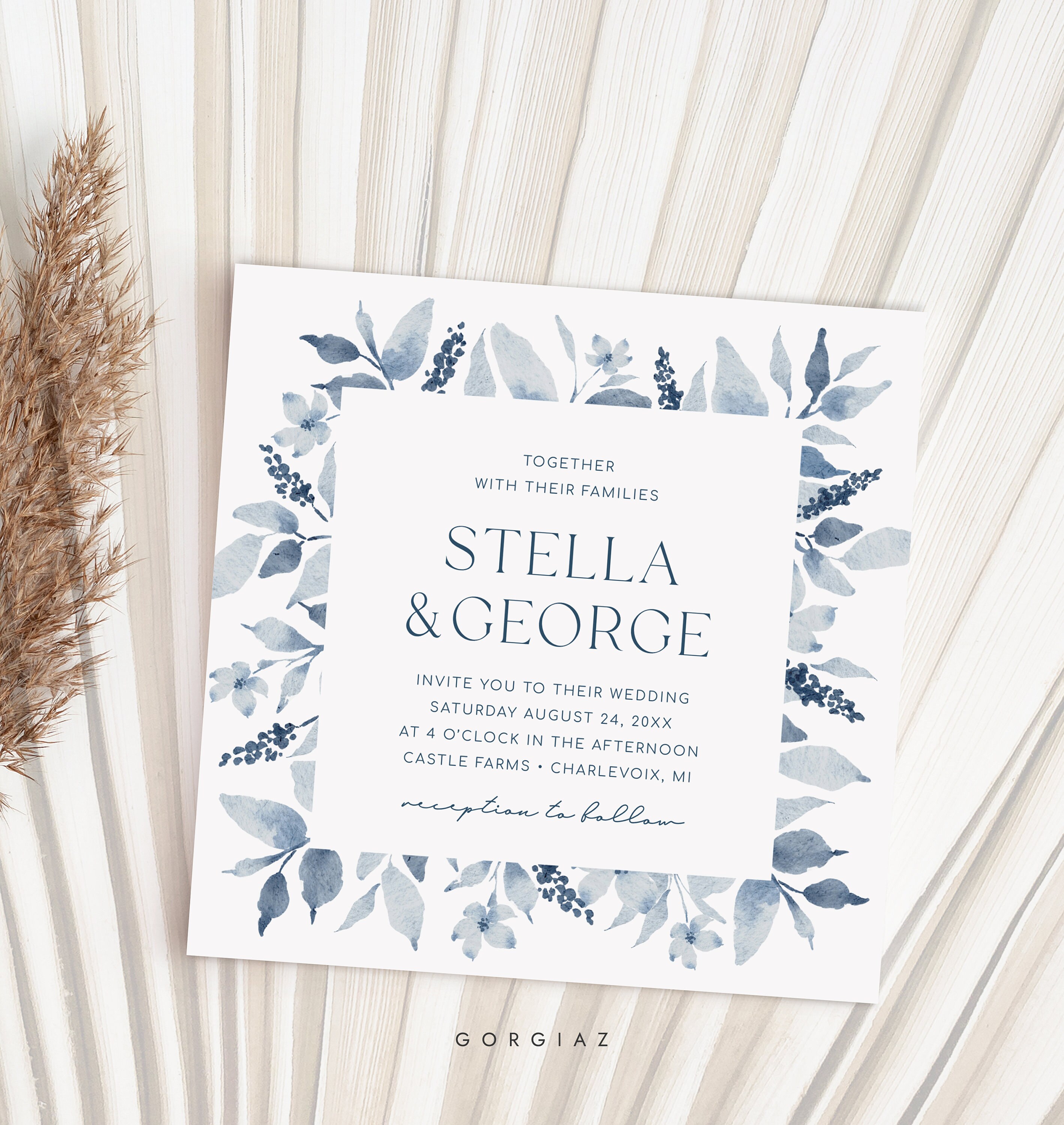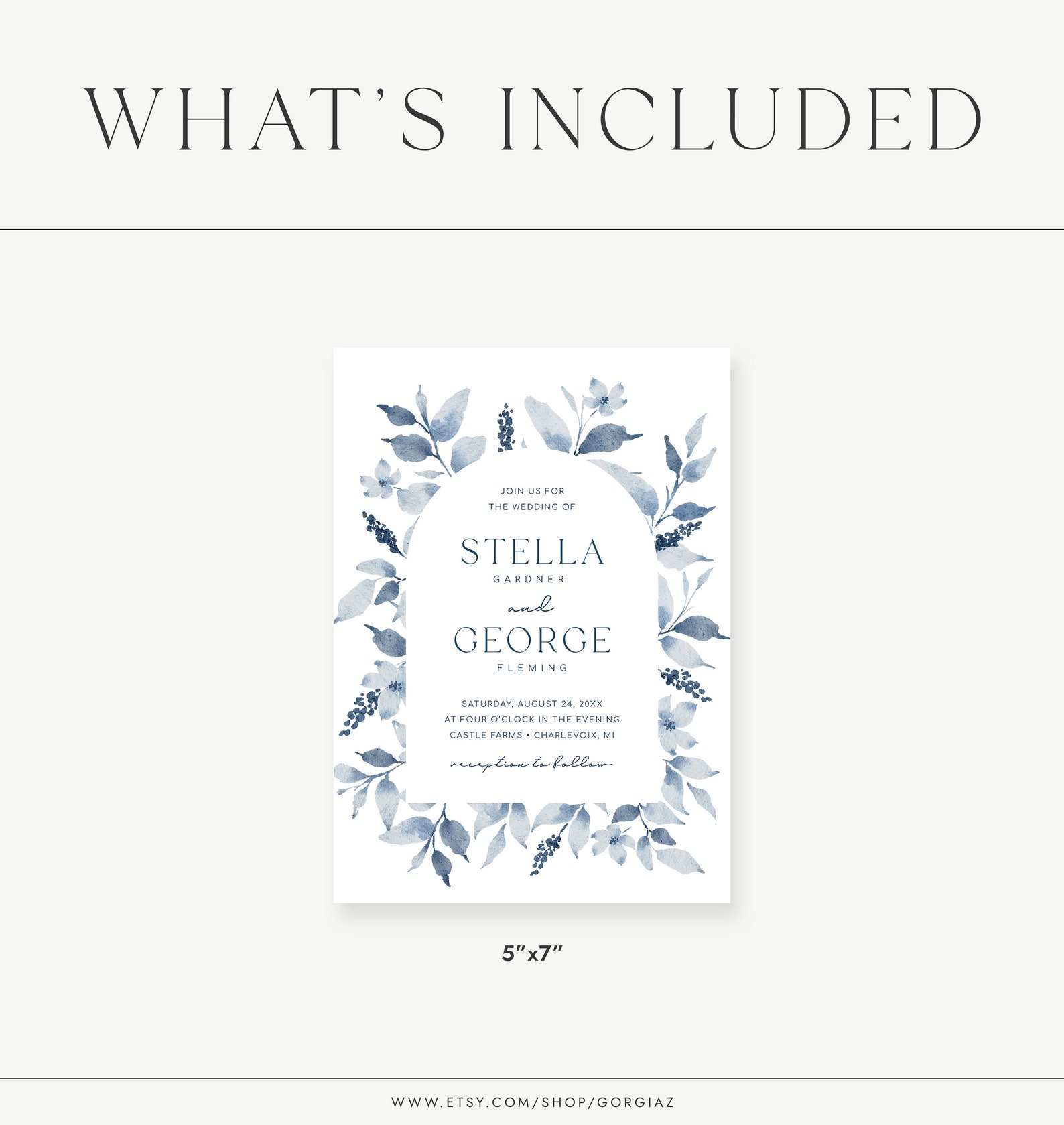 Dusty Blue Wedding Invitation Template Set Boho Floral Wedding Invite